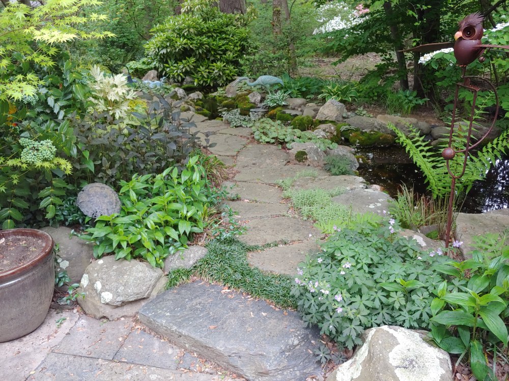 The path ends (above) with an edging of ground hugging variegated sedum and dwarf Mondo grass between the last path stone and a dark, basalt step bordered to each side by tall toad lilies (Tricyrtis). A circular patio, retained on the top side by lichen covered boulders, provides a relaxing view of the lower half of the stream and path. But, there is good reason for the weary gardener to pull himself up from the shady, cushioned comfort of brightly painted chairs on the patio to view the upper half of the stream and path.