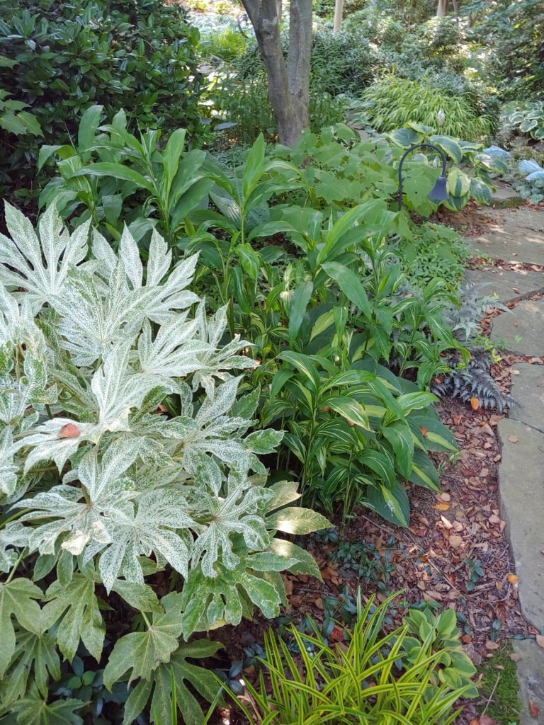 Of three variegated leaf fatsas (Fatsia japonica ‘Spider’s Web’ (above) in varying degrees of shade, one along the path outgrows others by double with late day sun exposure. Uppermost leaves have been unusually white this year, though certainly these will fade to the typical green with prominent white veins.
