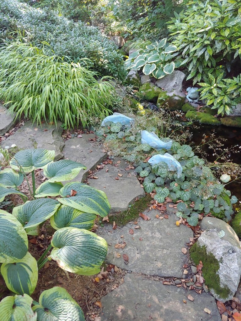 The fatsia, large leafed hostas, hardy gingers, and a Korean yellow wax bell (Kirengshoma koreana, above) give a tropical feel to the path, and with rich green, moss covered stones edging the pond it is no wonder this is the favored place in the garden.