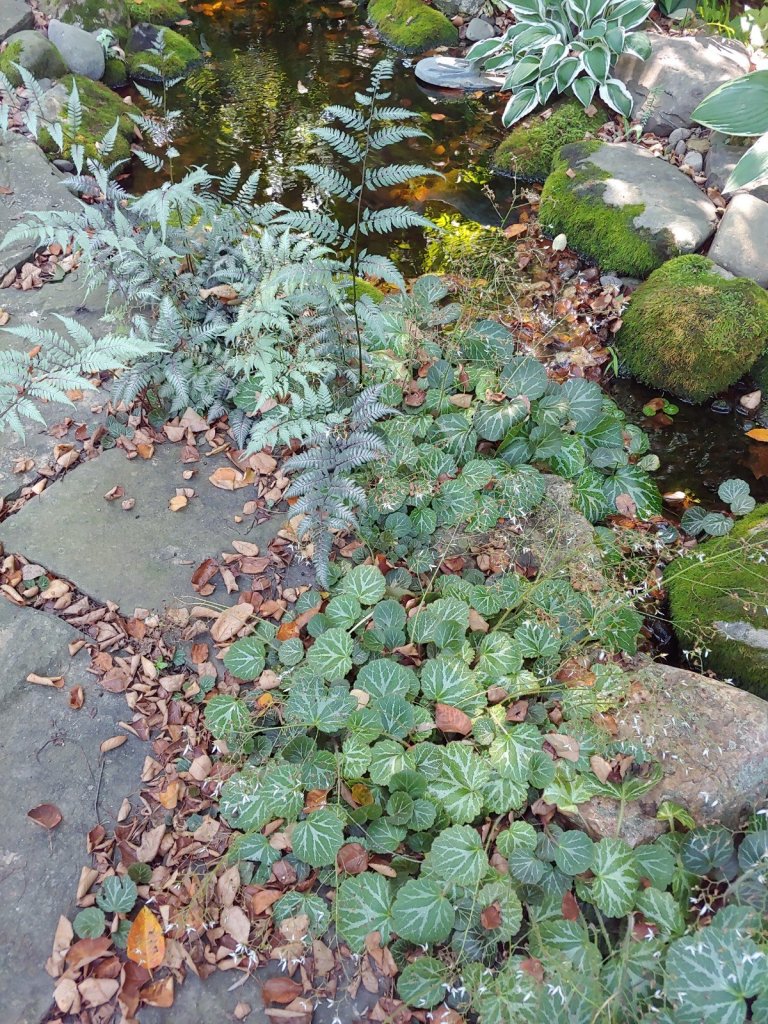 A crude stone path parallels the stream with river gravel between that has been covered by seedlings of geraniums, strawberry begonias (Saxifraga stolonifera, above), and a variety of fern sporelings (mostly Japanese Painted and native Sensitive ferns, but others also). The path is shaded by the serviceberry and two Japanese maples, but glimpses of the sun shine through before noon and in late afternoon, though never so bright as to scorch hostas that reside on each side of the path and stream.