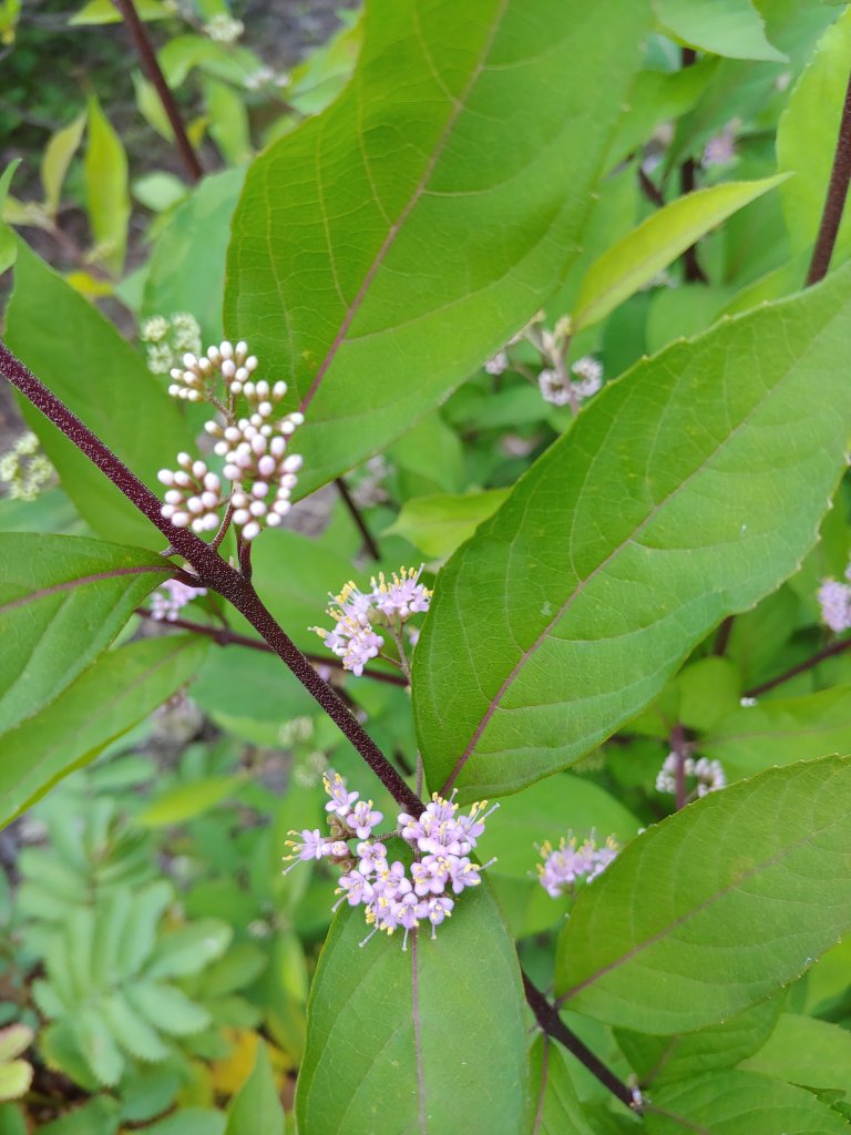 Callicarpa ‘Pearl Glam’, a name that I’m embarrassed to say out loud, but the dark leaves highlight the flowers much more than green leaved types.