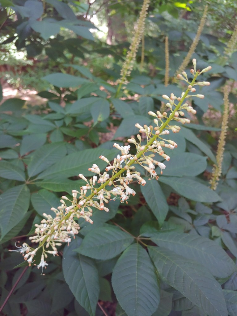 Flowers of Bottlebrush buckeyes (Aesculus parviflora) are likely to be past their peak when I return.