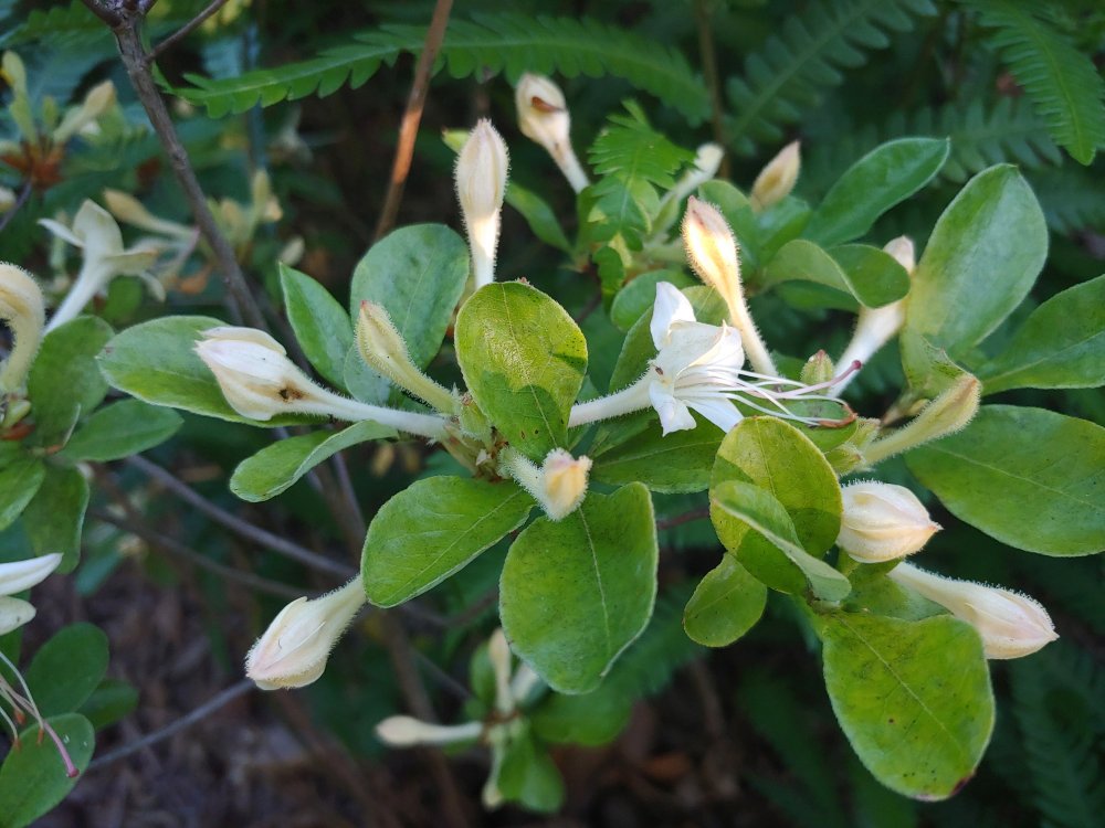 Two native smooth azaleas (Rhododendron arborescens) are just beginning to flower in mid July.