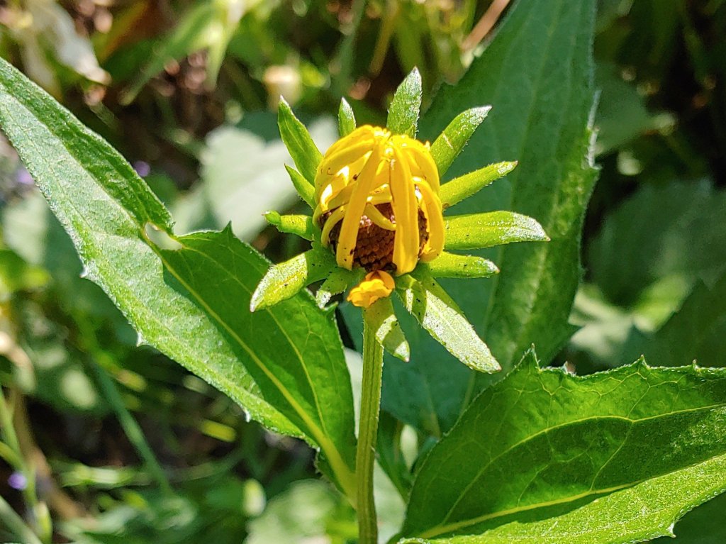 Seedling rudbeckias, blown in from the neighbor’s garden since they disappeared in the shade in this one decades ago, are just beginning to flower.
