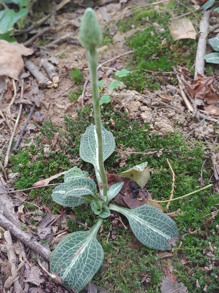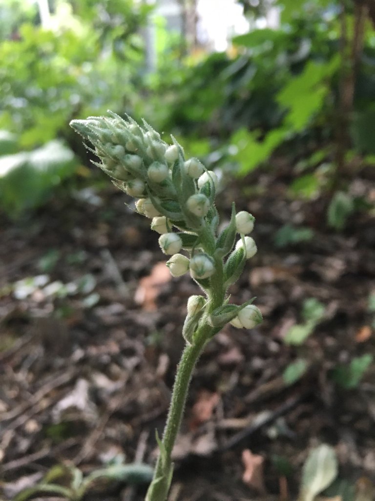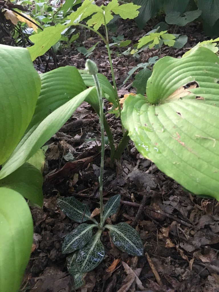 On occasion, a bulb is unearthed or sliced, or one thing is planted within inches of another. Usually, these minor conflicts are easily corrected, and again I see that a Downy Rattlesnake plantain (Goodyera pubescens, above), one of several native orchid varieties in the garden, is planted beneath a wide spreading ‘Sum and Substance’ hosta (below). Ten others (by my wife’s count) reside in ground left open for these tiny treasures.