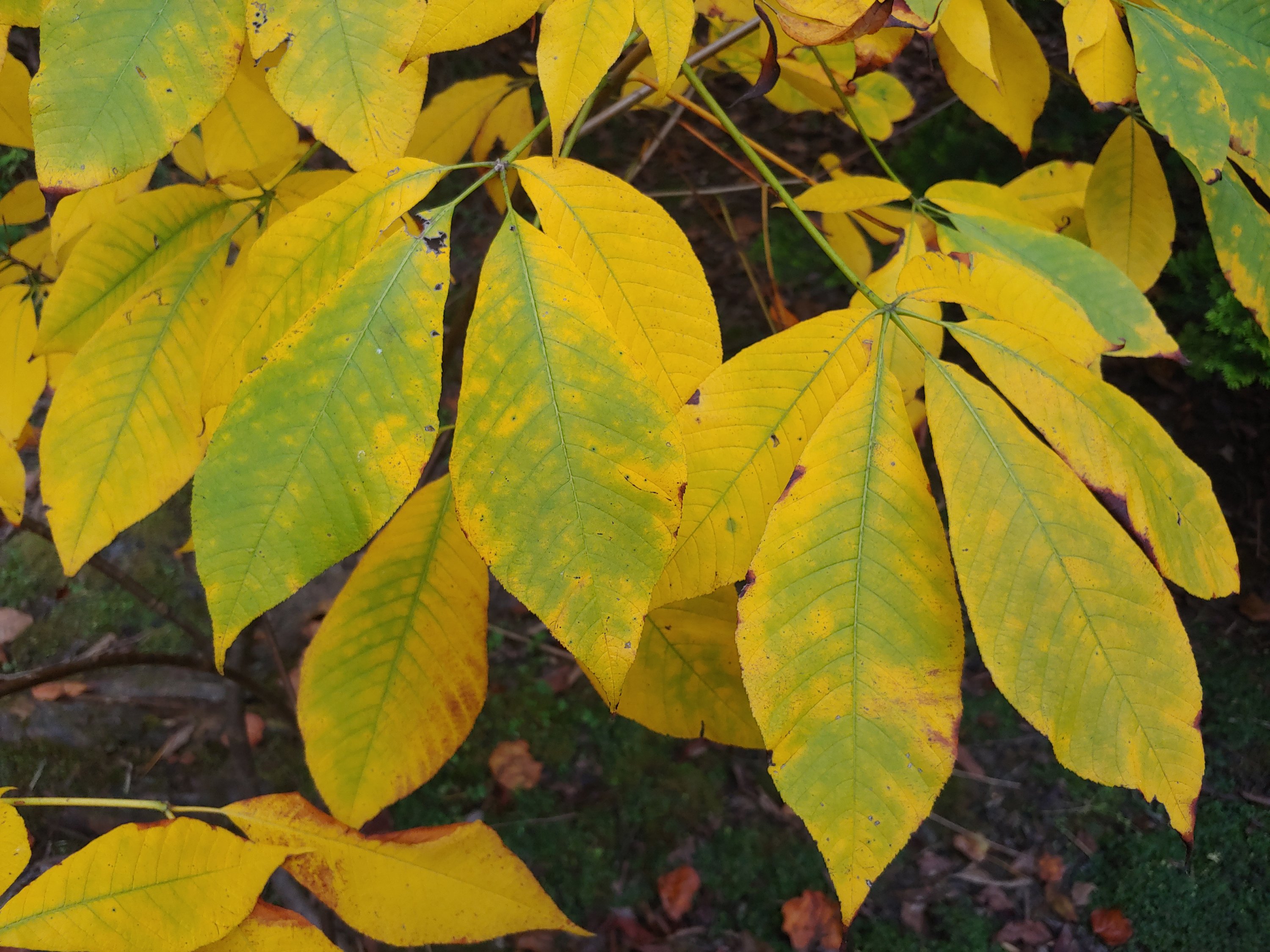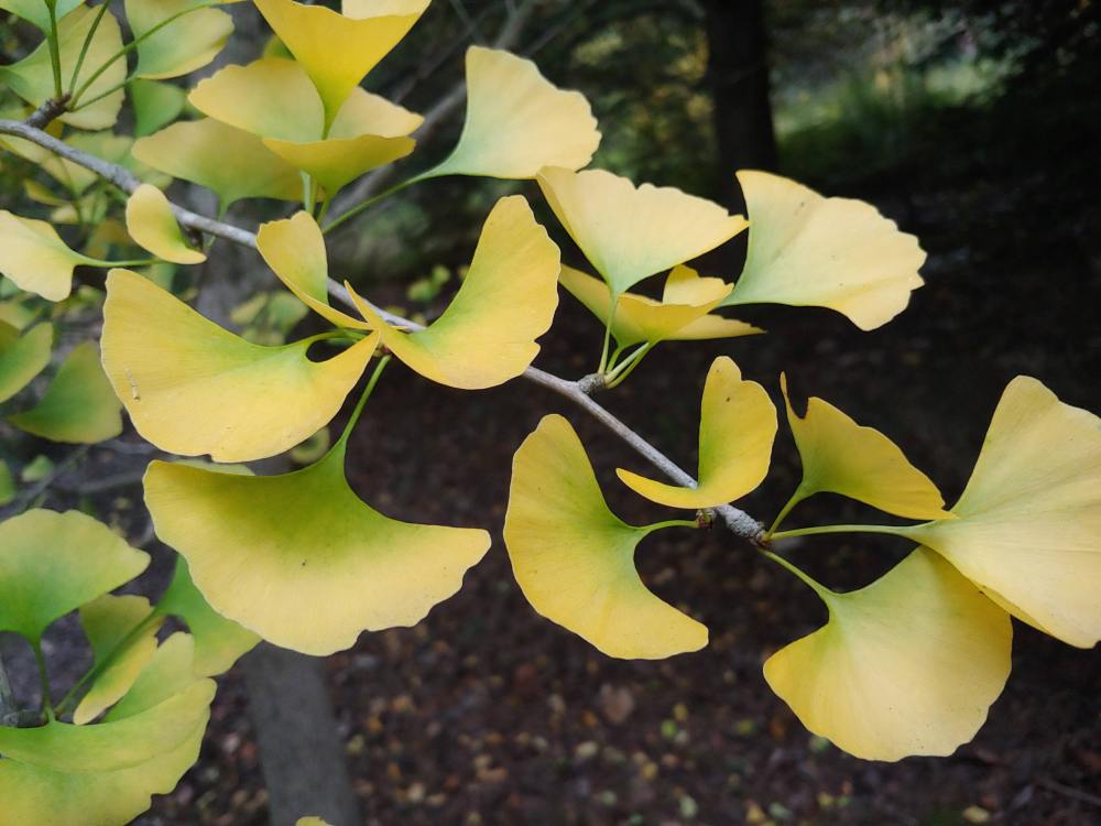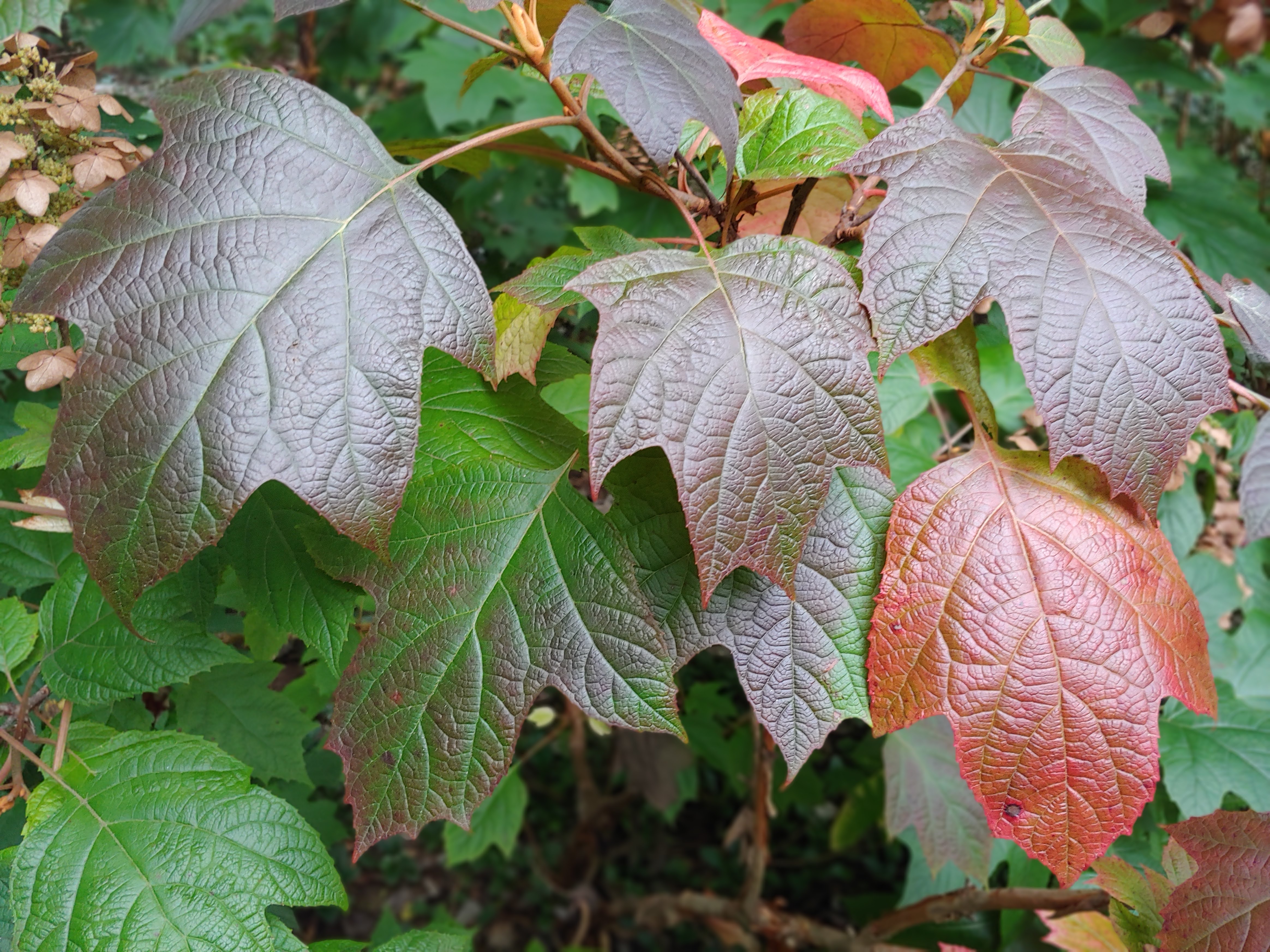 In the garden, dogwoods (Cornus florida) turn early, at least most years though not so much this year. The ginkgo (Ginkgo biloba, above) has turned to glowing yellow, and then one day soon every leaf will drop within a day. The oakleaf hydrangeas (Hydrangea quercifolia) are mixed, with some burgundy leaves, but still many that remain green. With temperatures closer to freezing all leaves will turn, and many will remain until the new year before falling.