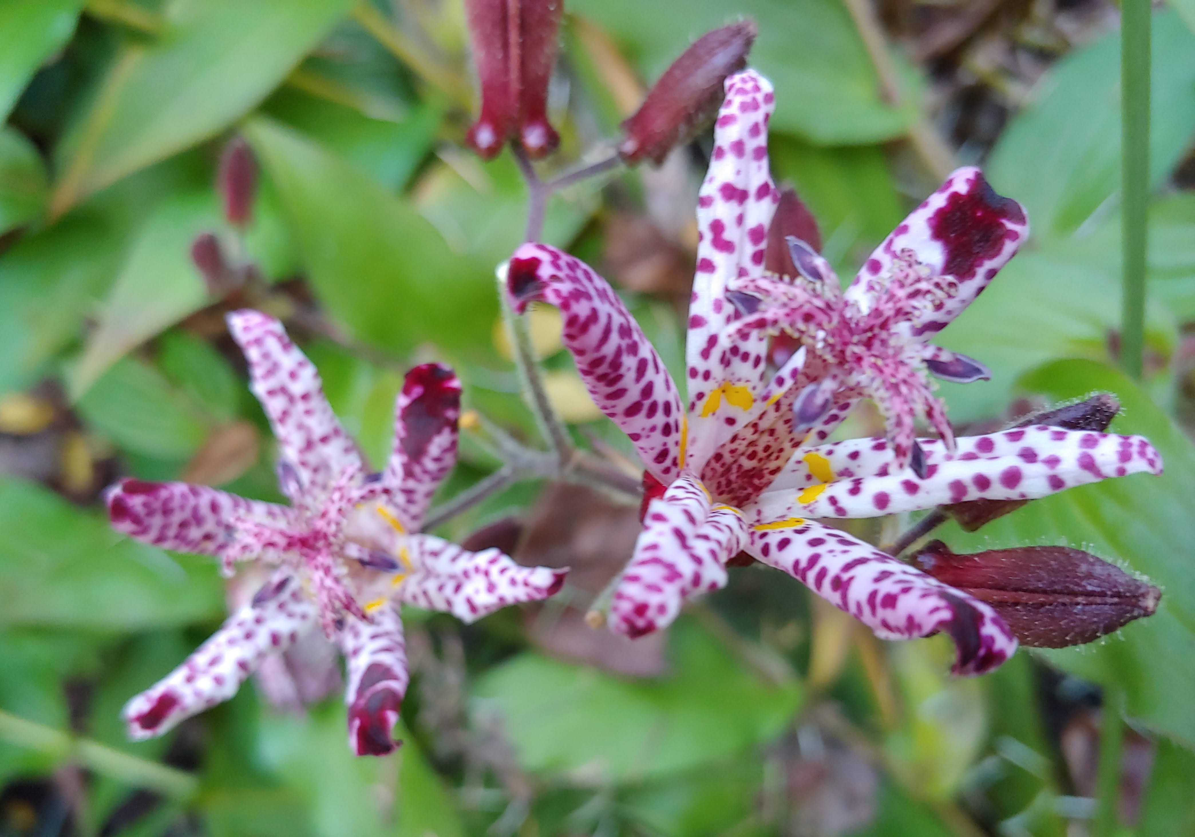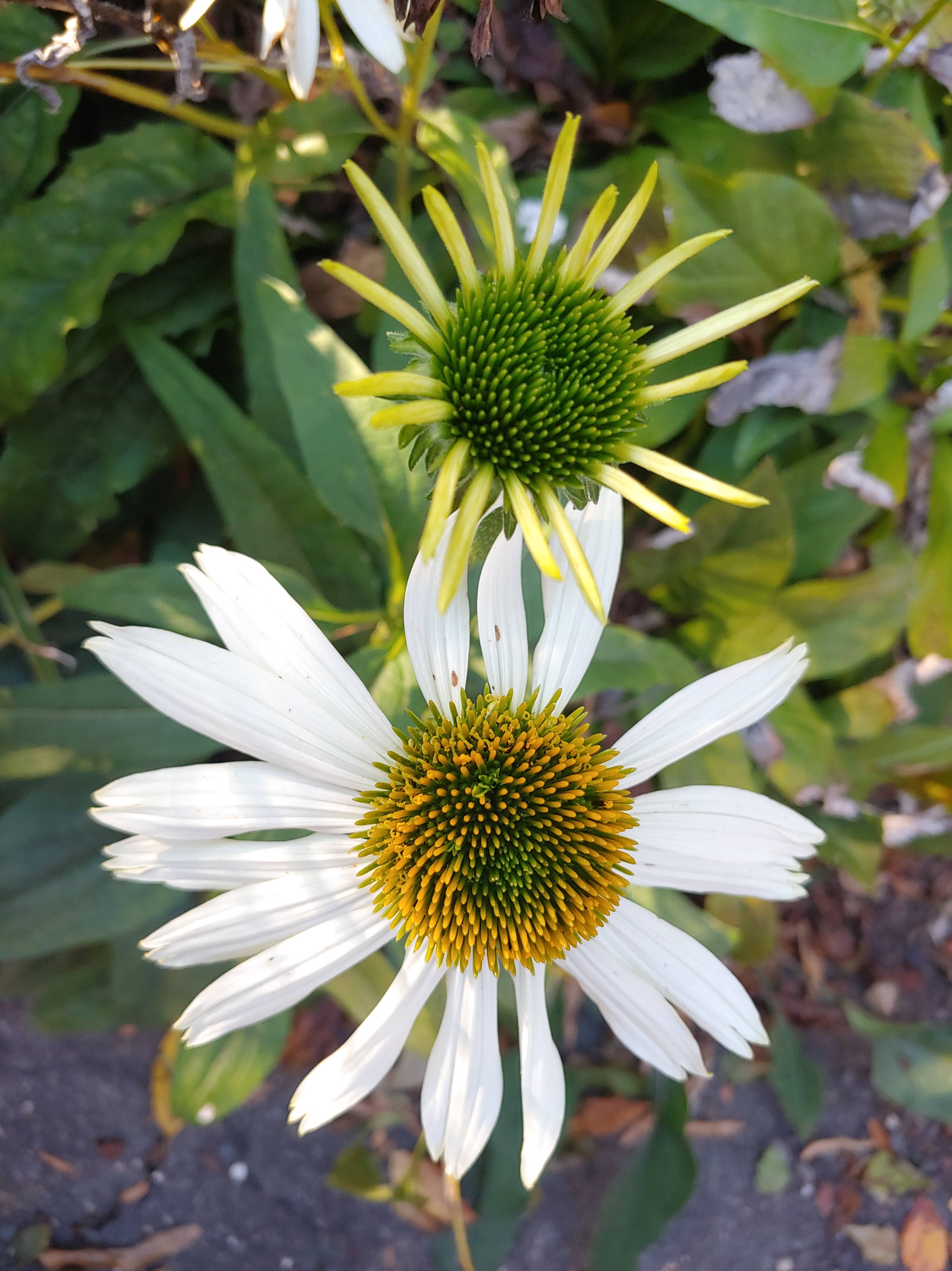 Before freezes put an end to the season of perennials, there are many flowers, with several toad lilies (Tricyrtis, above) just beginning to bloom. The mixed batch of seedling purple and white coneflowers (Echinacea, below) continues in bloom, though mostly white flowers, and of course with many browned seedheads that will spread coneflowers into every nearby inch of open space.