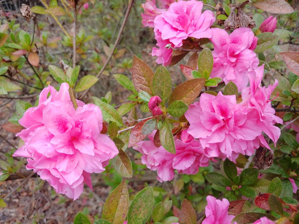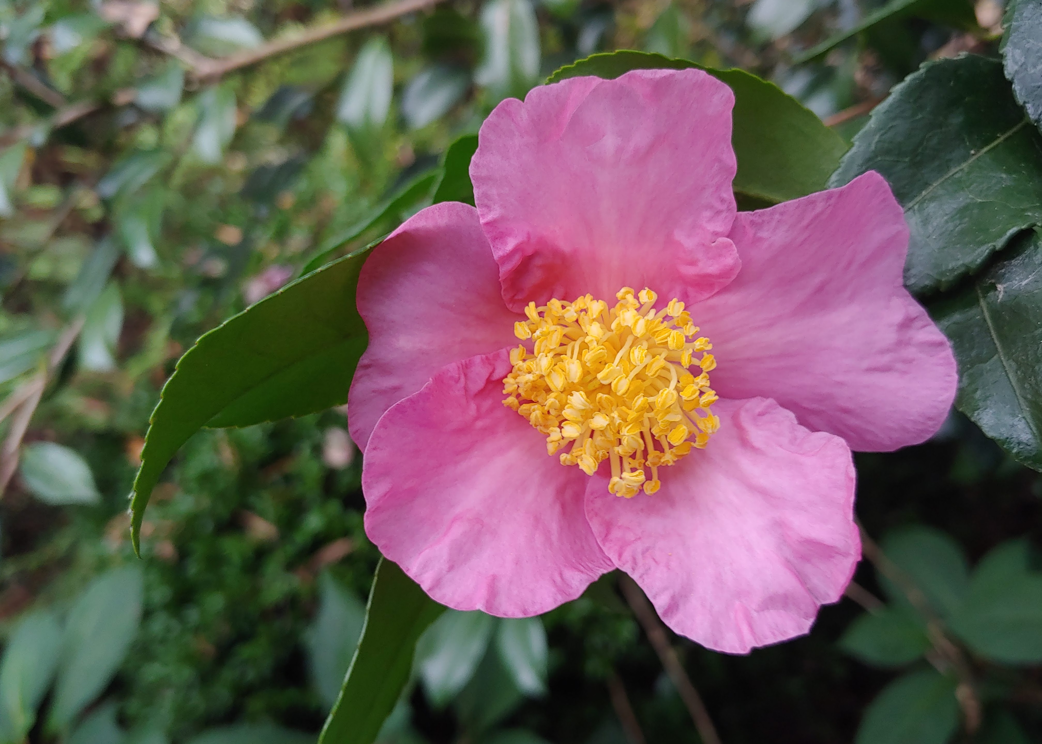 The autumn bloom of Encore azaleas has been tardy. While ‘Autumn Twist’ and ‘Autumn Carnation’ (above) are often at their peak by early September, both (and others) are just getting started. A year ago, the autumn flowering camellias (below) were exceptional, and with the first flowers and many buds swelling, these should soon join the reblooming azaleas in a glorious display of blooms in this early autumn.