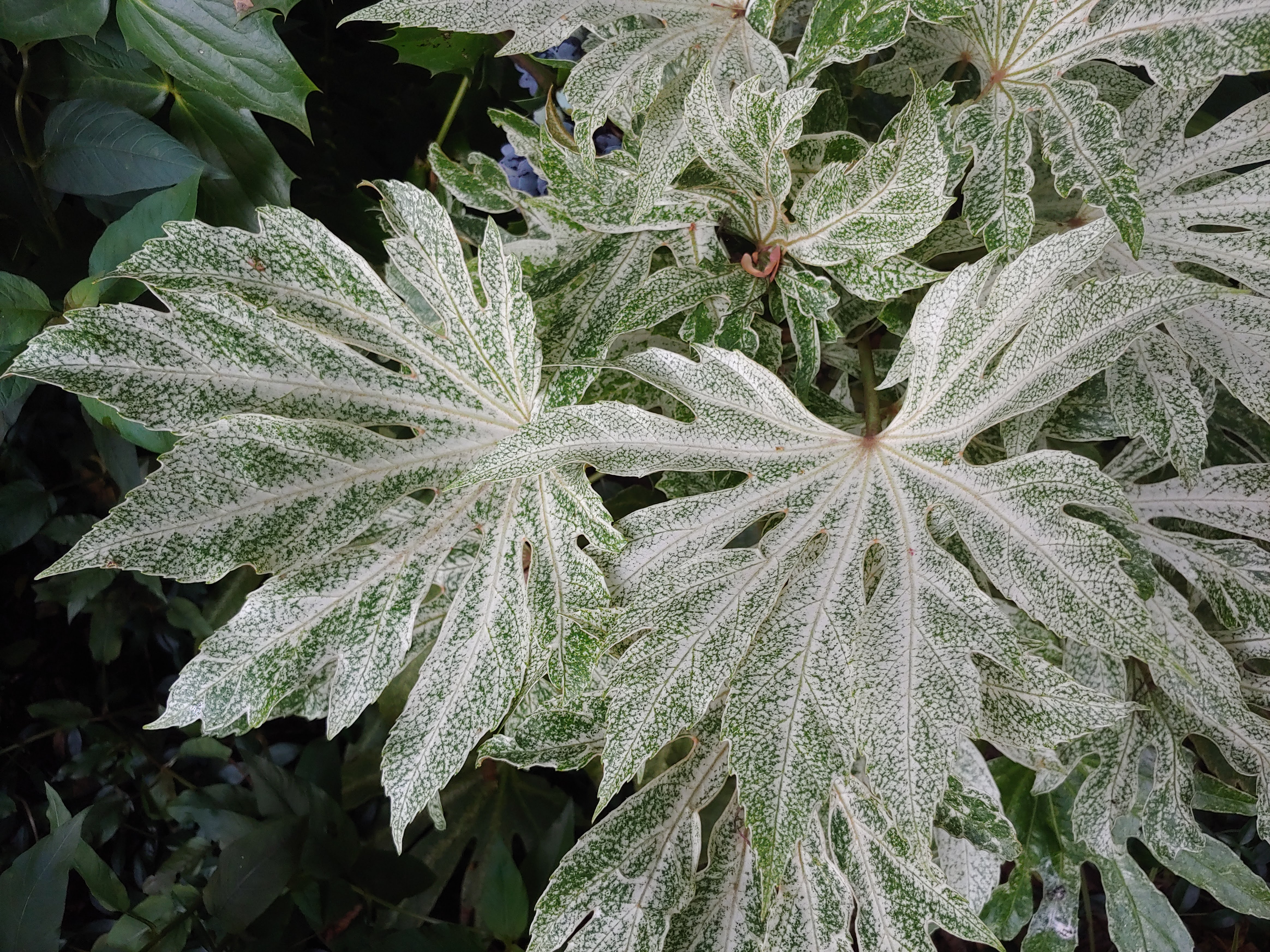 There are several ongoing trials in the garden, with tribulations certain to follow. If forecasts for another mild winter hold true, though one as “warm” as last winter cannot be expected, ‘Spider Web’ fatsias (below) might survive again without protection. Though rated as hardy to zero, I lack trust that these will tolerate temperatures below ten degrees (Fahrenheit).