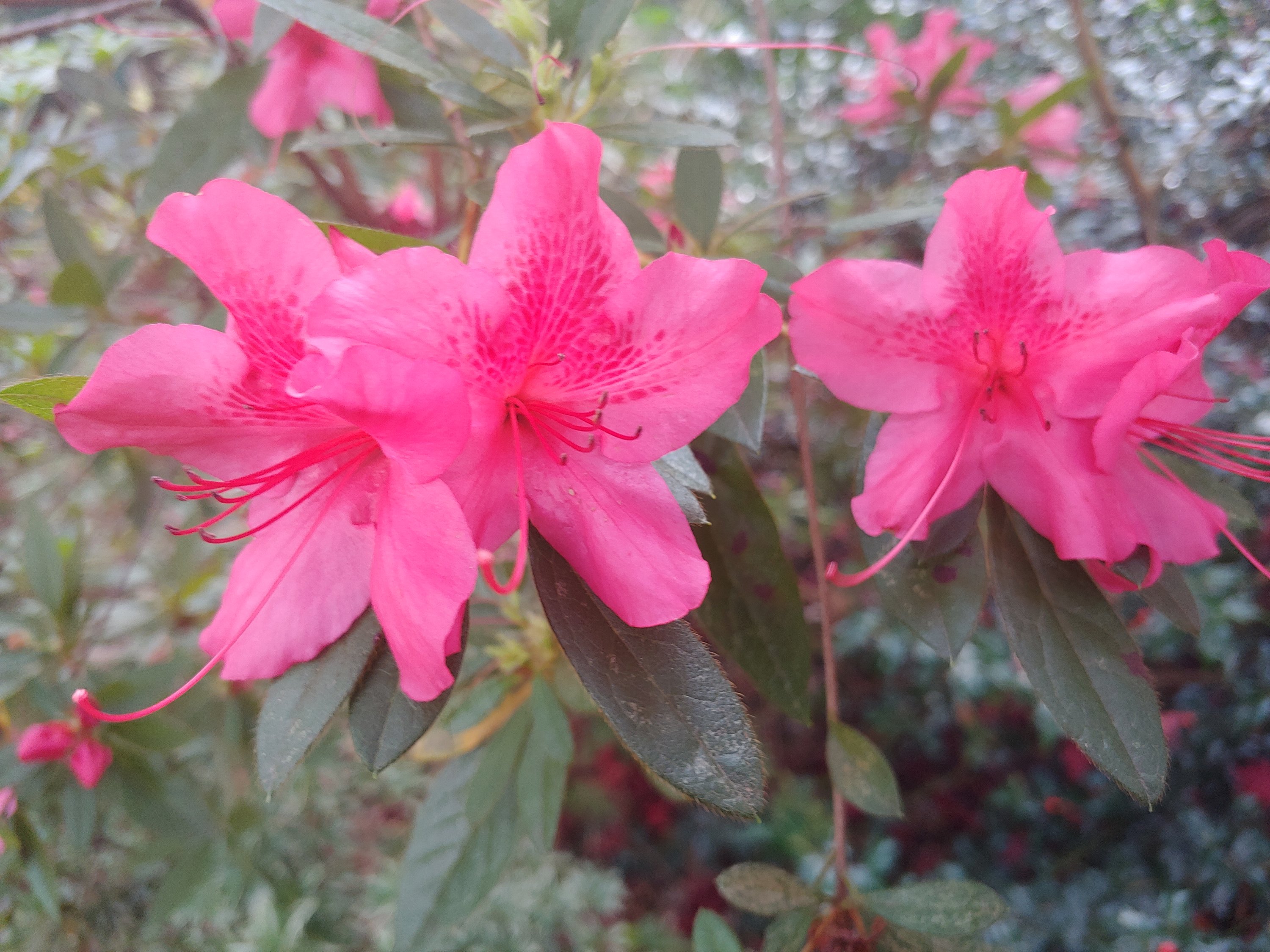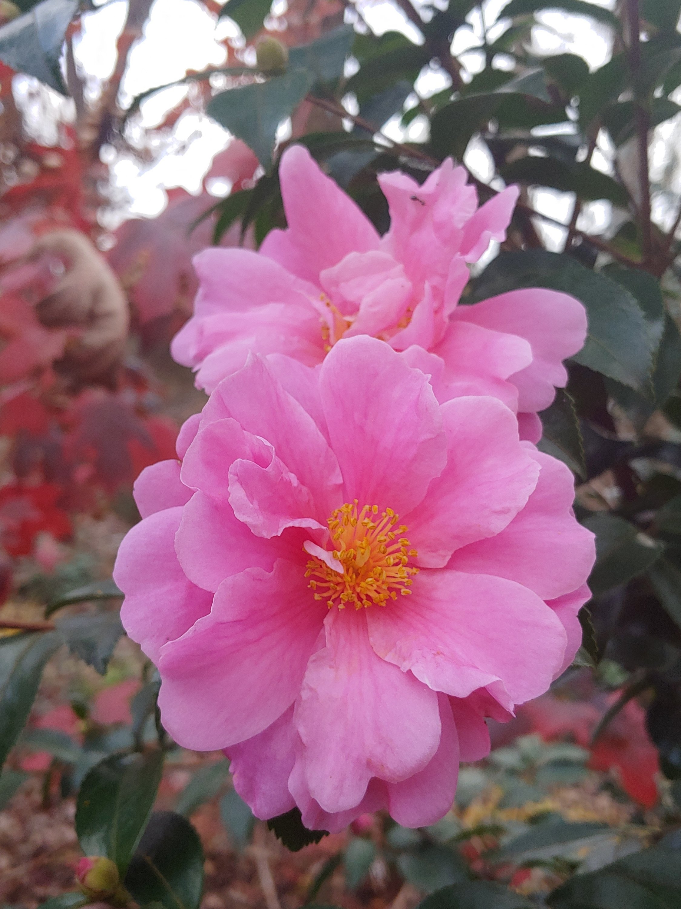 With overnight temperatures forecast to fall into the low twenties, I am curious to see what becomes of flowers of Encore azaleas (above) that were tardy getting a start on their autumn flowering cycle. Flowers of autumn camellias (below) are usually damaged in the low twenties, but warmer days will follow and there are many buds remaining to bloom.