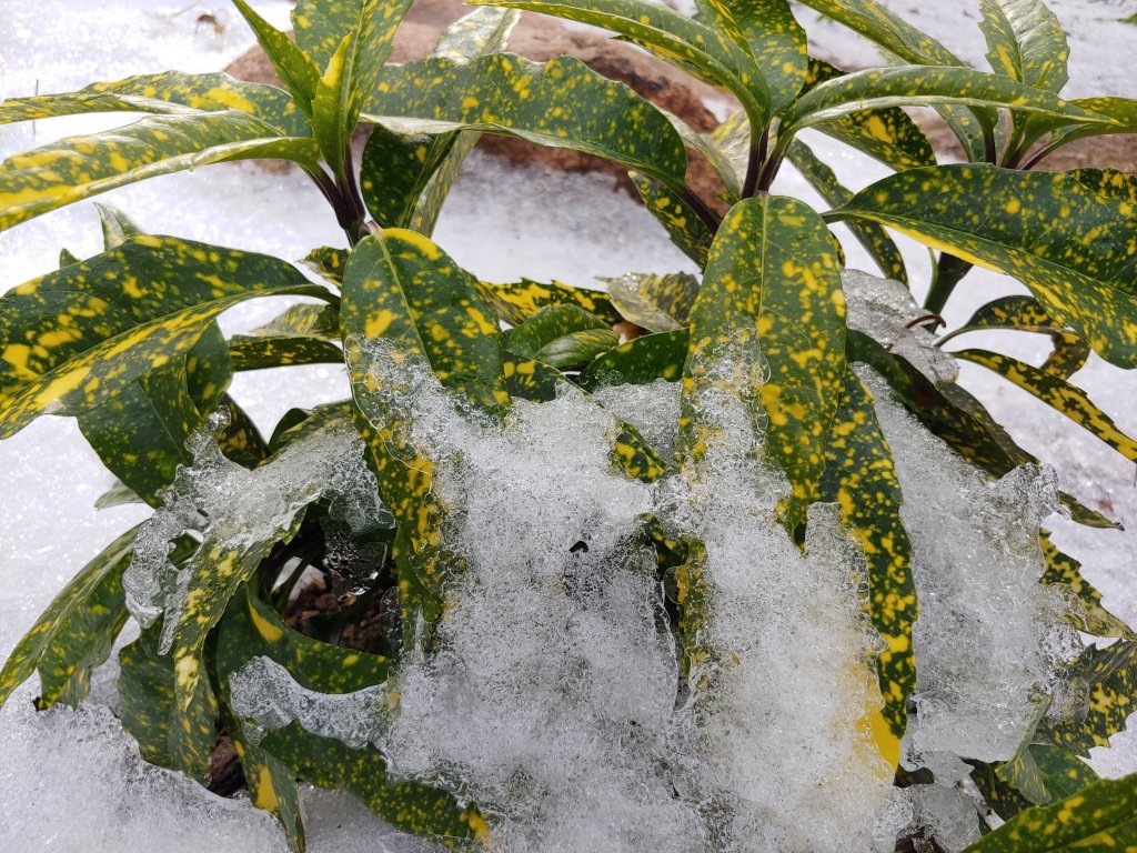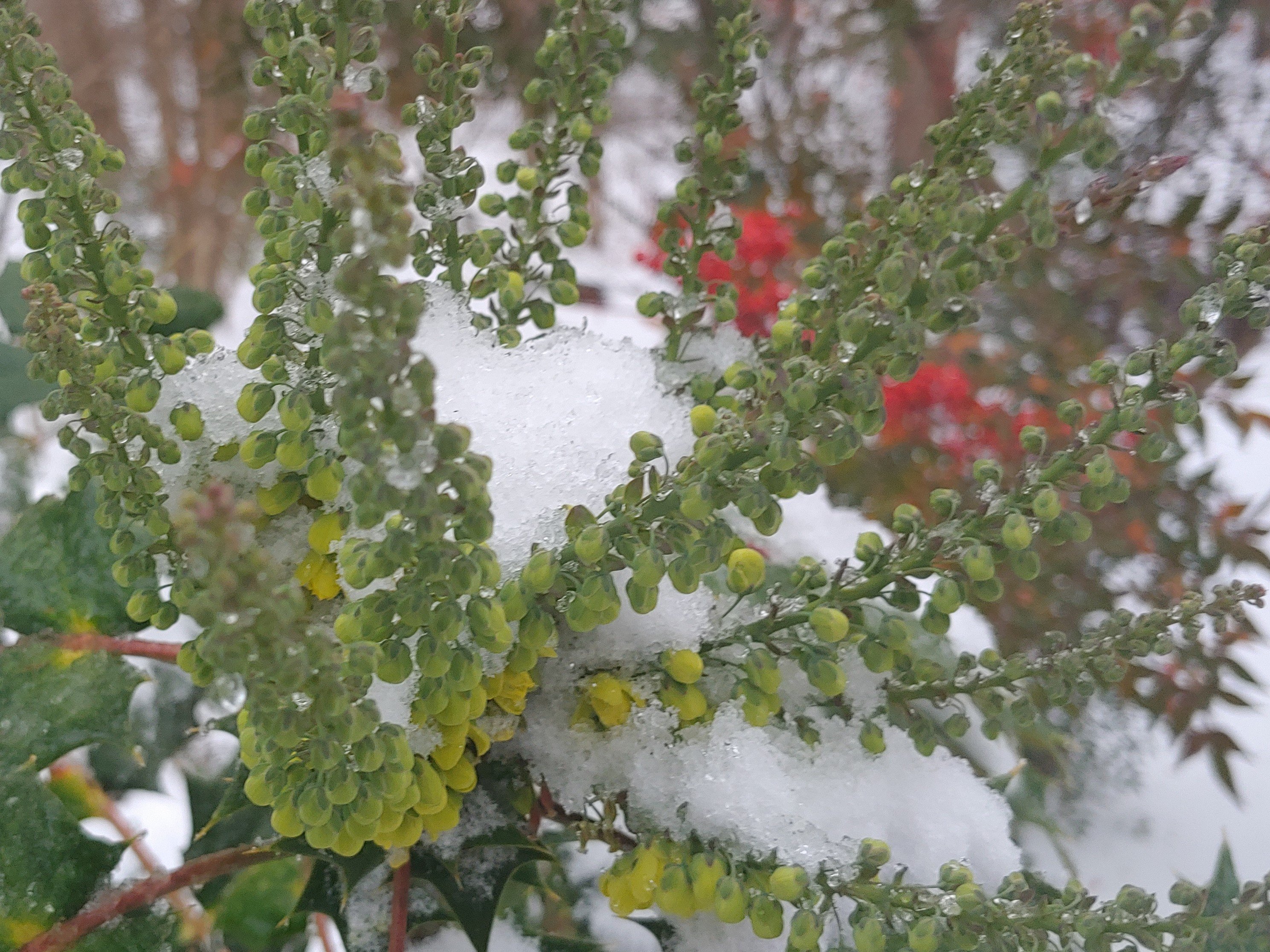 Broken branches of tall, flowering mahonias have been sloppily lopped and discarded, though fortunately the damage is to only a fraction of these long established shrubs. With unsure footing and temperatures still in the mid thirties by late morning, this is not the time for neatness, so cuts must be cleaned up some time later. I am concerned that split branches might suffer in the coming months, but most often established shrubs endure the abuses of weather with few problems.