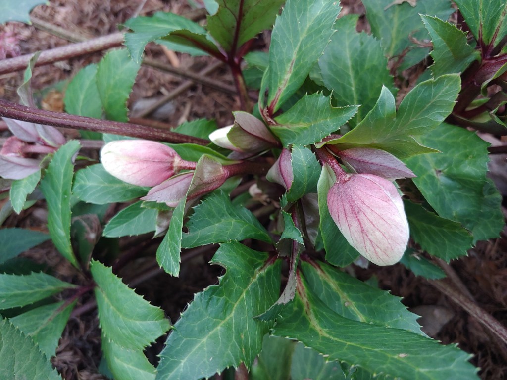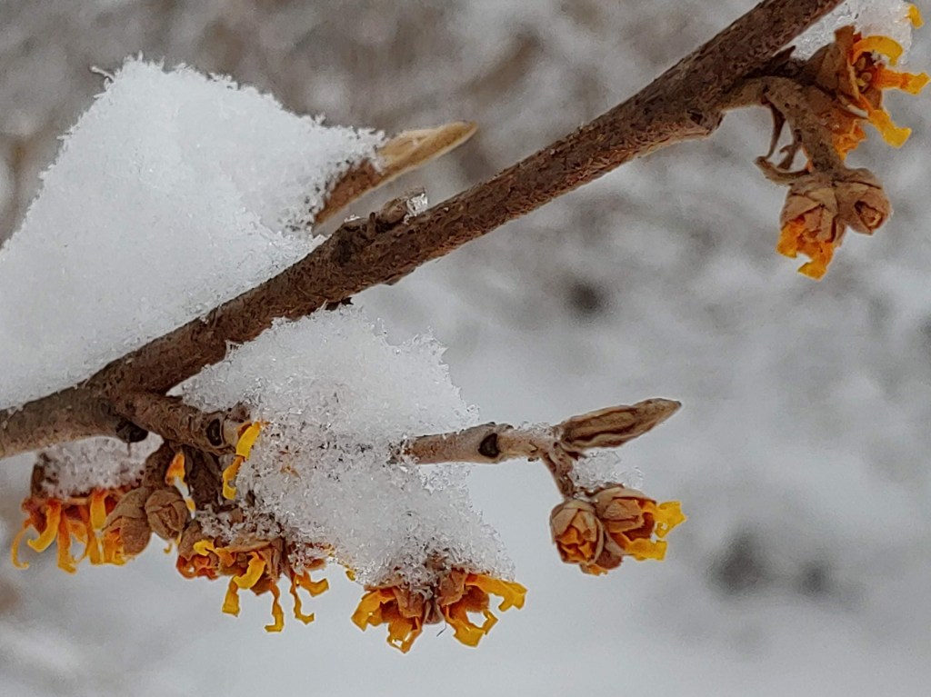 While the blanket of snow promotes a sense of calm, I will be increasingly anxious through this month. I will be thrilled if mild temperatures return to get the garden to an early start, but I expect that flowers of winter jasmines, witch hazels, and paperbushes will be delayed, as will many hellebores (above) and snowdrops that show a glimpse of color but have not progressed in recent weeks.
