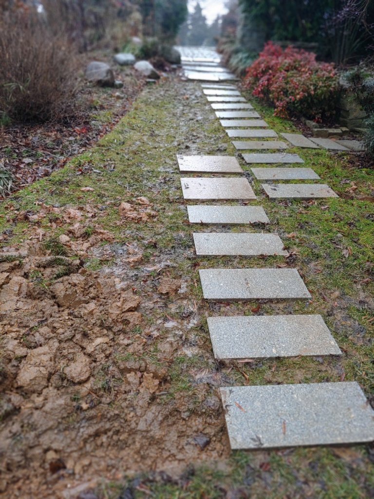 With the garden covered by varied degrees of snow and ice in recent weeks, the thinly grassed lawn connecting to the rear garden has become a muddy mess. The narrow passageway from the driveway to the garden has long been a problem, with a poor stand of neglected turf and too much foot traffic. At the first sign of trouble I should have veered the long way around, but of course, I didn’t.