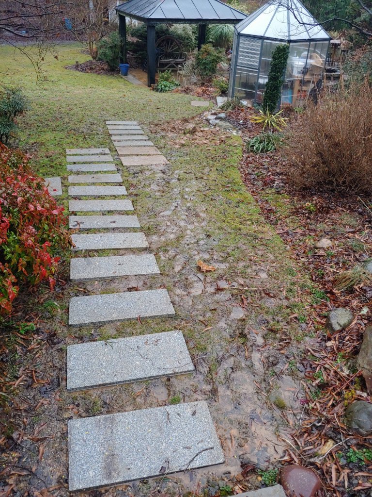 With the lawn beyond repair, and never an area that inspired me, I’ve recently considered changes that would combine paving, small granite boulders, and gravel to cope with the mud. But, since this muddy slope has become too treacherous to walk on without extreme care, I have now quickly laid granite flagging, nestled into the mud, parallel to the stone wall. A turn was necessary to veer around the wide spreading Fernleaf Japanese maple, and then the path ends in a small section of lawn that is somewhat flatter and wider (also poor, but not destroyed). This was a design as I go project, and while it was hastily prepared and executed, I expect that only minor modifications will be necessary a month from now. For now, I can make it into the rear garden without slip sliding, unless of course, it is ice covered which it has been since the morning after the flagging was laid.