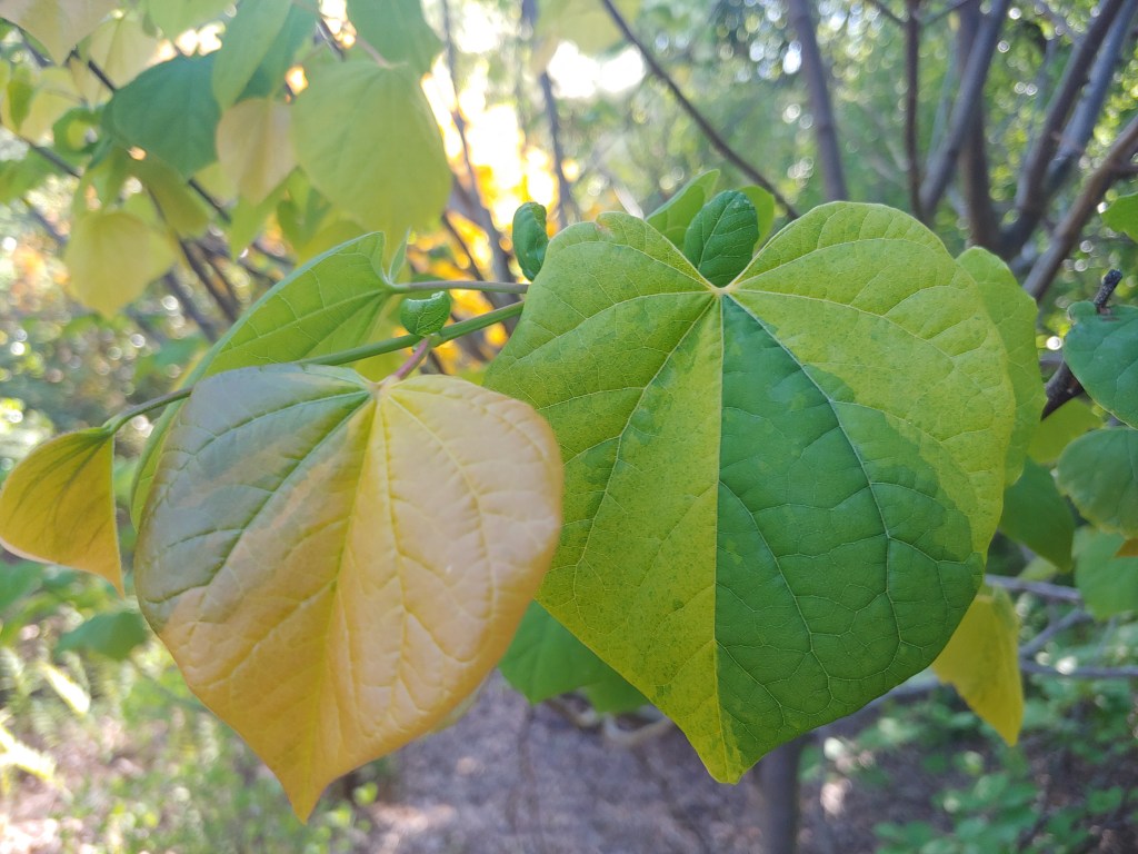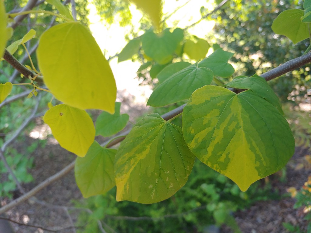 In November I planted a large redbud that is a sport (mutation) of the yellow leafed ‘Rising Sun’ (above and below). Certainly, the tree is not an improvement over ‘Rising Sun’, but I noticed it in a tree grower’s field in the mountains of North Carolina amongst hundreds of yellow leafed redbuds, and there’s something to say about having a tree that’s unique, perhaps the only one that exists. No, this doesn’t mean it’s worth anything, but the tree looked to be a vigorous grower, and as its leaves emerge this spring with varied colors and mottling I’m quite happy to have it. I expect the variegation to become more distinct as the leaves mature, and I’m curious to see what becomes of leaves that are now all green or all yellow.