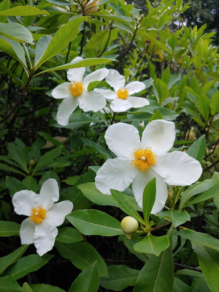 The camellia-like flowers of gordlinia (x Gordlinia grandiflora, above) first appear early in August, then continue sporadically into mid-September. This shrubby tree is perfectly located behind tall perennials so that its unremarkable multiple trunks are well hidden, but its large blooms stand above its neighbors. While gordlinia’s flowers and foliage should earn a front row seat, inevitably the evergreen leaves turned a crispy brown after even the mildest winter.
