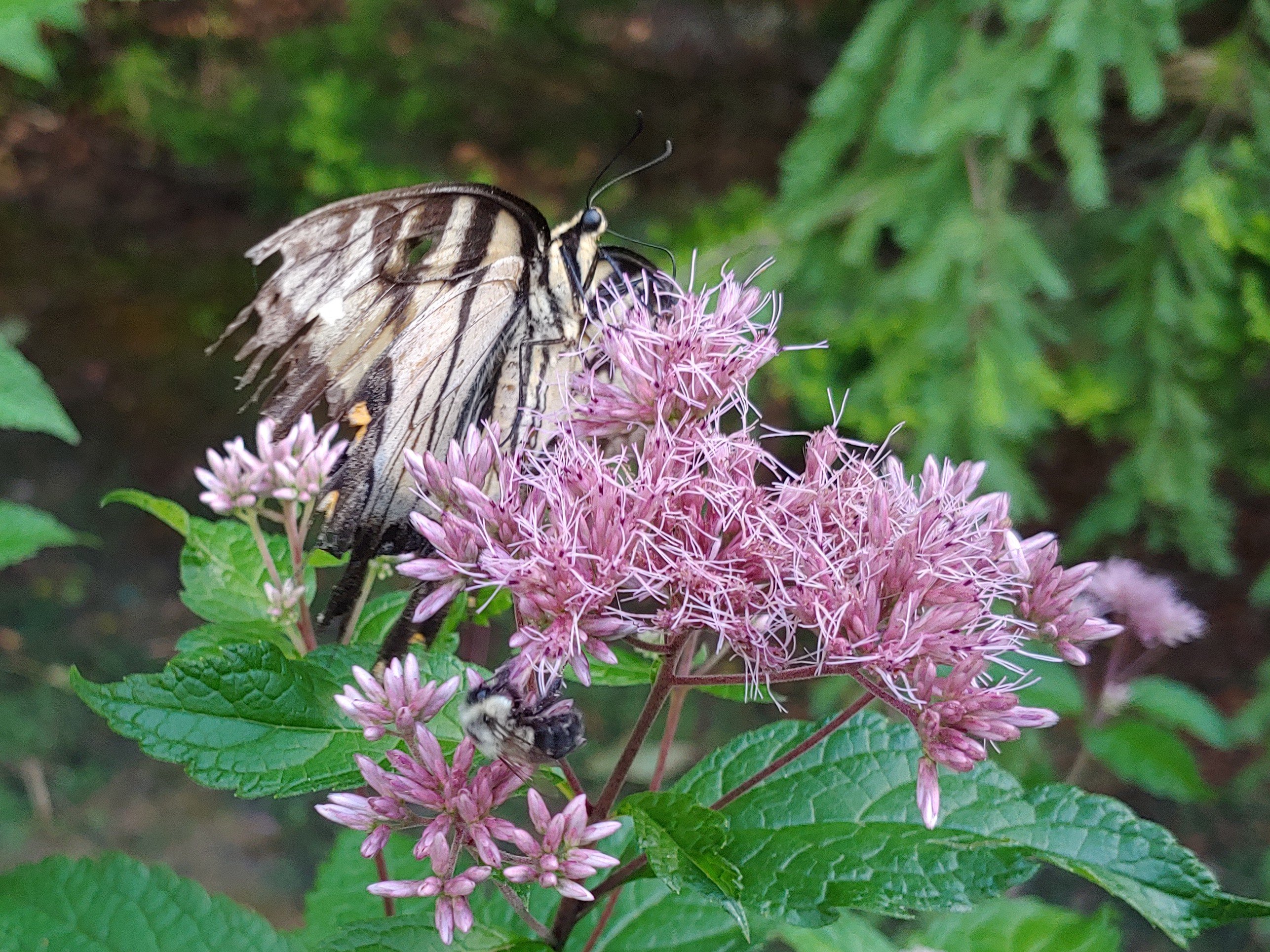Most of the Joe Pye weeds (above) are weeks past bloom, except several that were pruned in late spring by deer. These have fattened up, and now they’re flowering to the delight of the resident swallowtails.