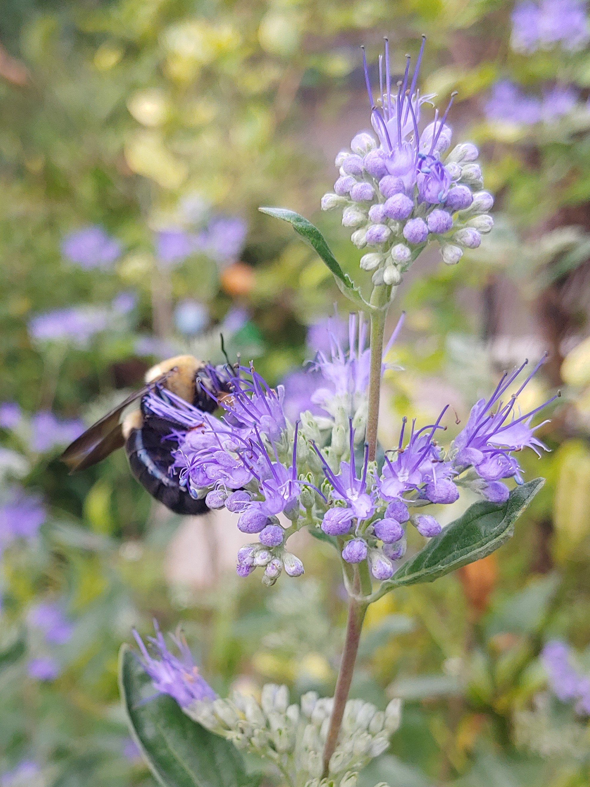 Bees are constant visitors to the variety of blue mist shrubs (Caryopteris, above) that are nearing the close of their month long bloom cycle. The foliage of blue mist is slow to get started in spring, but most varieties have pleasing blue-green or yellow leaves.