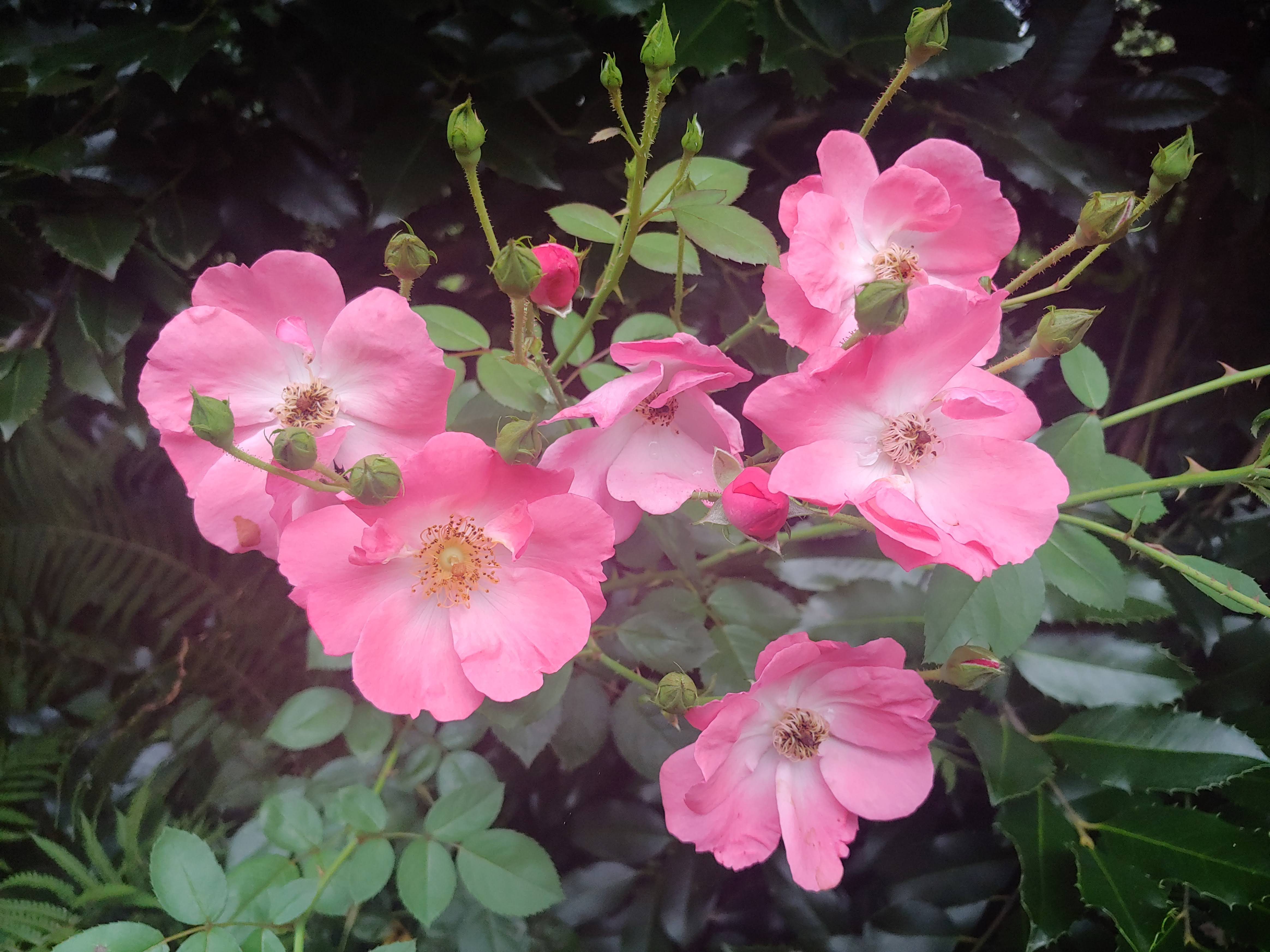 Roses are scarce in the garden since I do not care to spray for any bug, disease, or fungus, but one old rose (above), its name long forgotten, stands out in late summer from beneath a wide spreading holly. The leaves are free of spots that disfigure so many roses in our humidity, though perhaps reflected heat from the asphalt driveway burns off any spores.