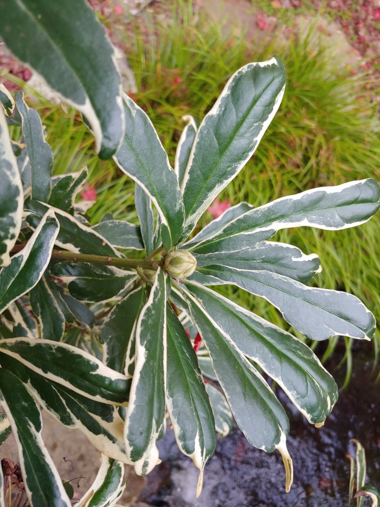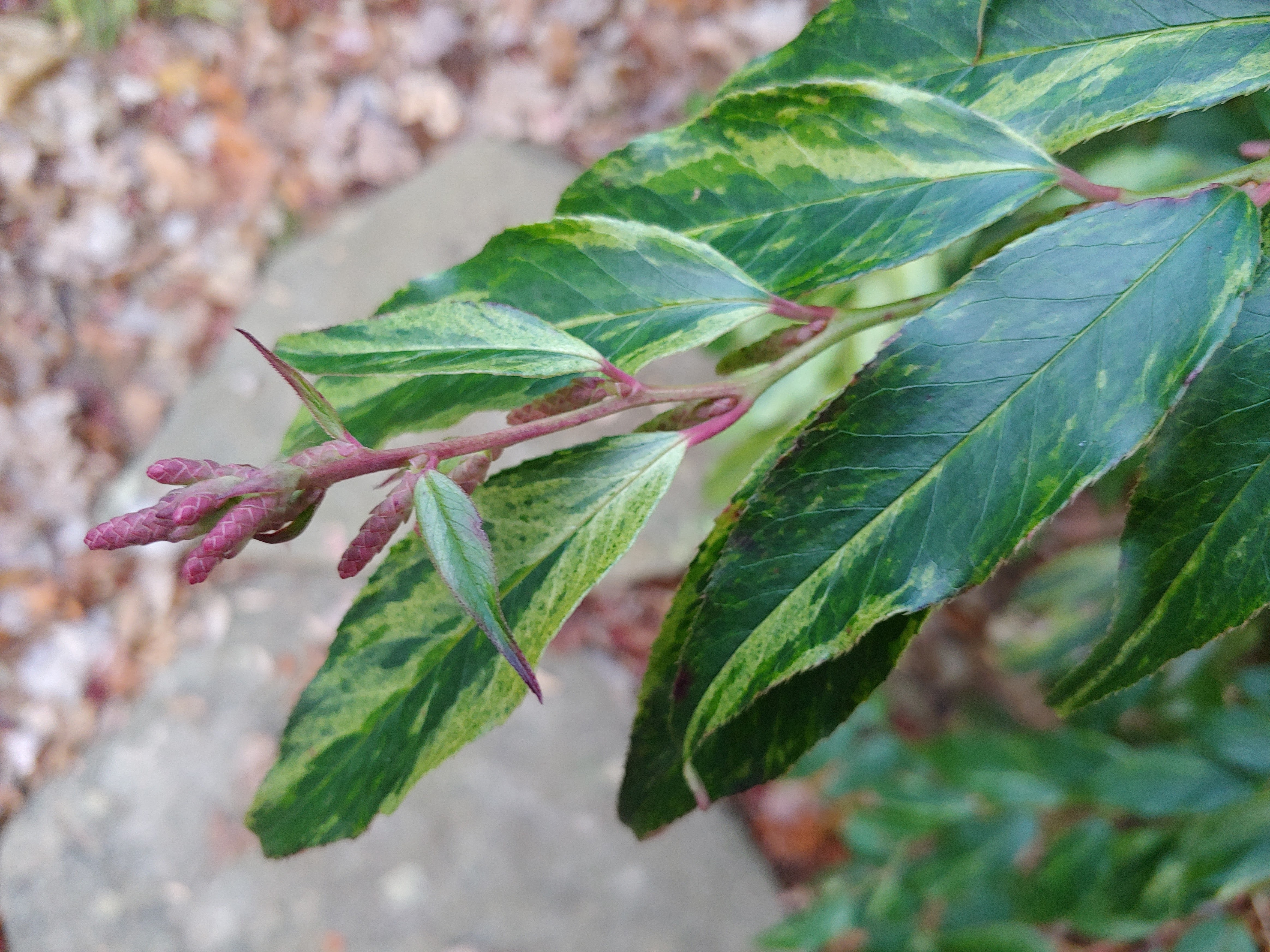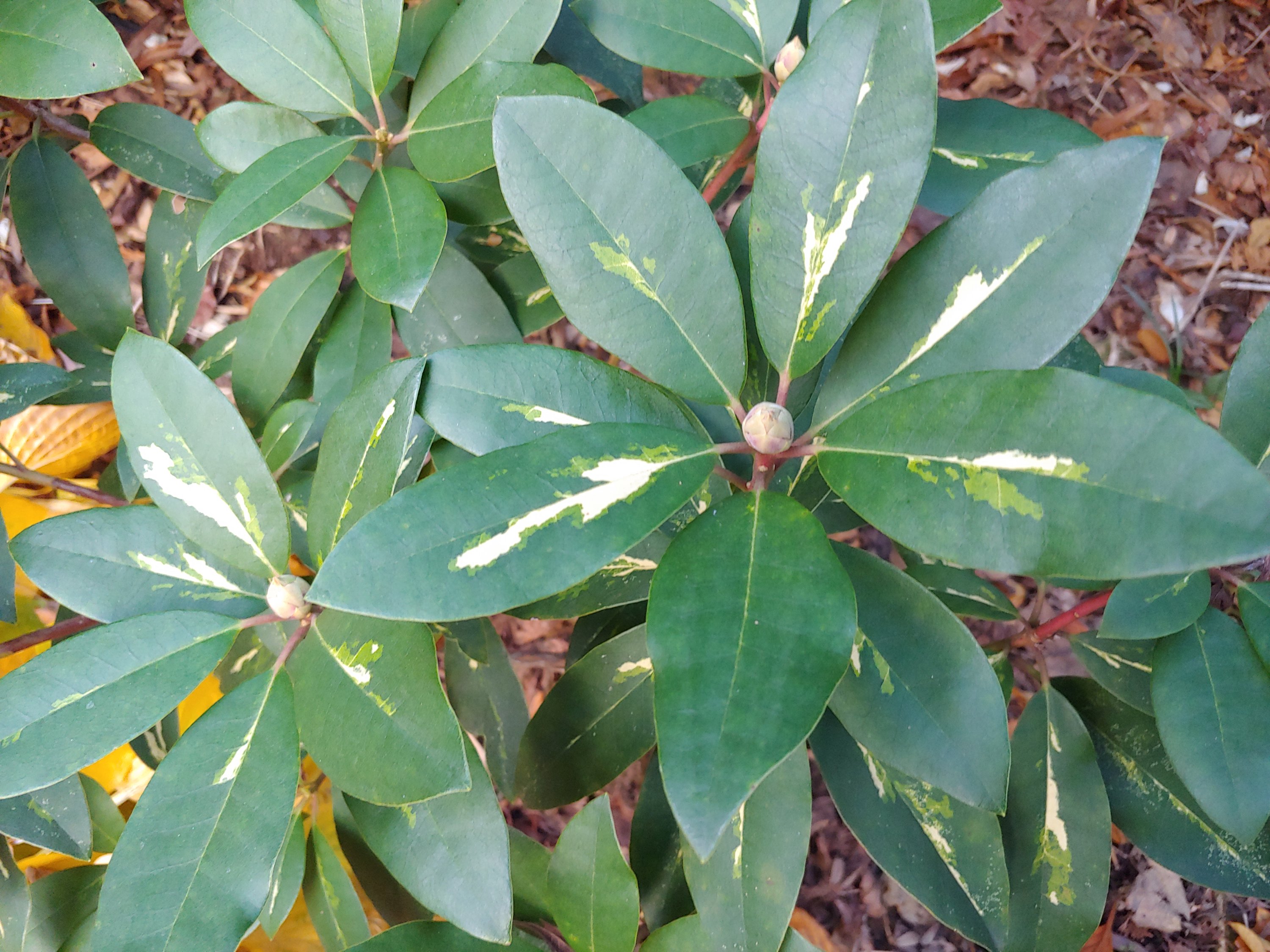 Flower buds are carefully watched in the winter months for the first signs of color, but fat buds of rhododendrons (‘Silver Edge’ above and ‘Goldflimmer’ below) promise color that will not arrive until May. Variegated foliage stands out in the winter garden, and it is likely there is more here than many would deem acceptable.