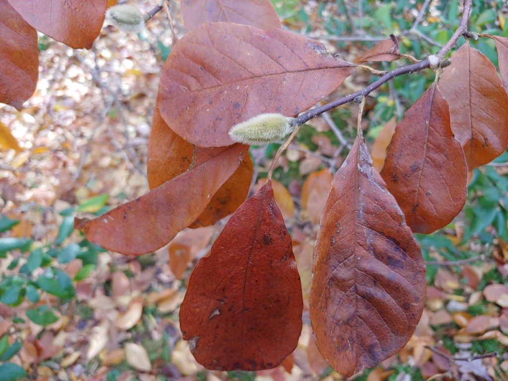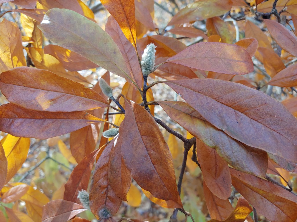 Fuzzy flower buds of early flowering magnolias protect against freeze damage, but early March blooms often suffer in late winter cold. Foliage of magnolias seemed more colorful this year, though leaves dropped overnight after these photos were taken.