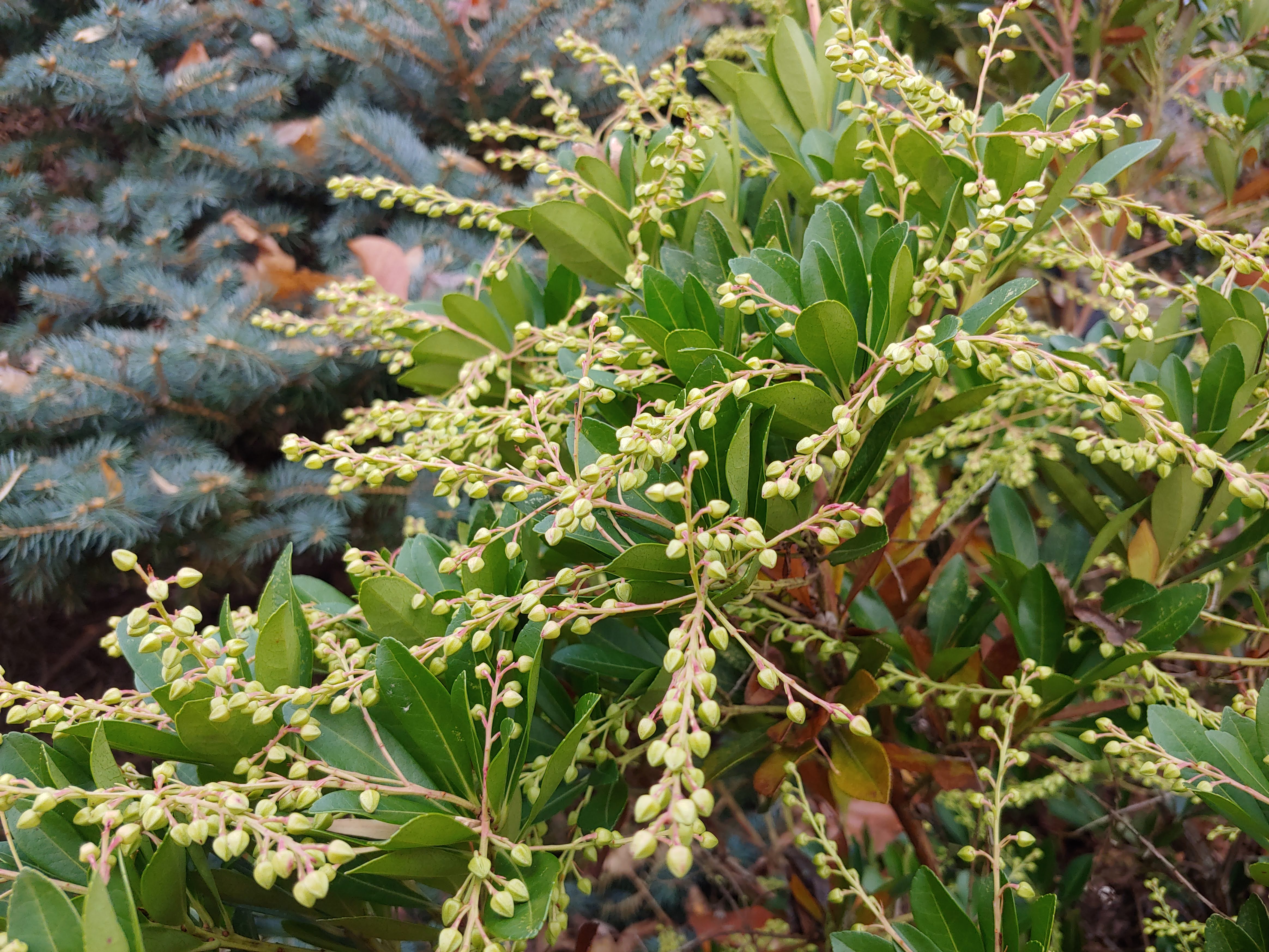 Colorful buds of leucothoe (Leucothoe fontanesiana ‘Rainbow’) and pieris (Pieris japonica) add ornament to the evergreens.