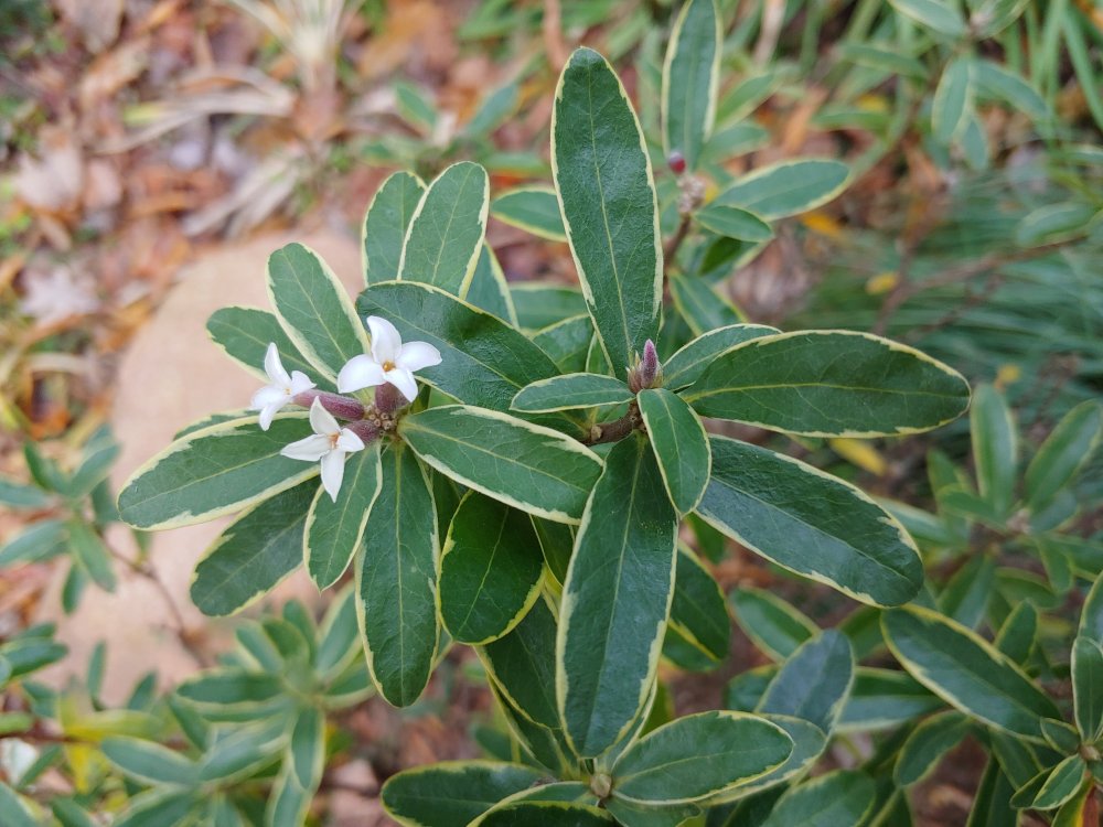 I am quite surprised that a ‘Summer Ice’ daphne (Daphne x transatlantica ‘Summer Ice’, above) displays scattered flowers, much later in autumn than I’ve seen. This daphne was planted earlier in the year in a sunnier spot than other daphnes, so I suspect this has extended its flowering. In a very mild winter it’s not unusual to see flower buds swelling, but the earliest I’ve seen flowers is mid-March, and in autumn there have been no flowers past mid-November.