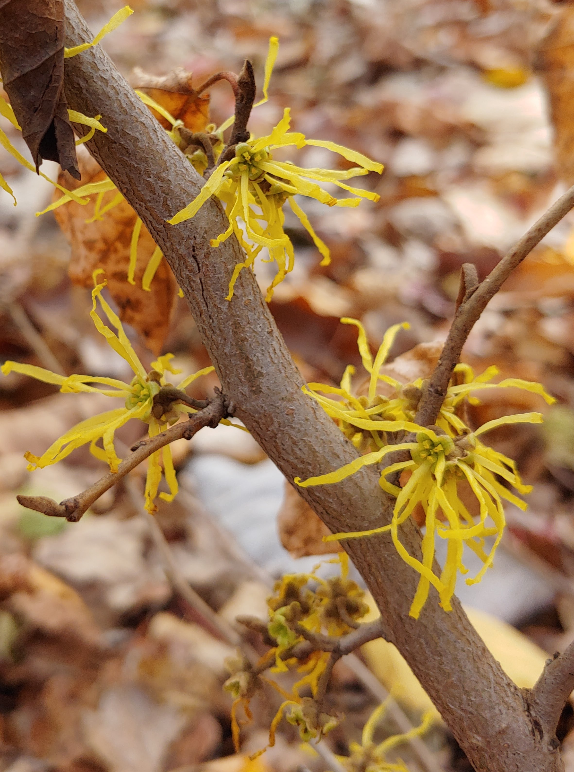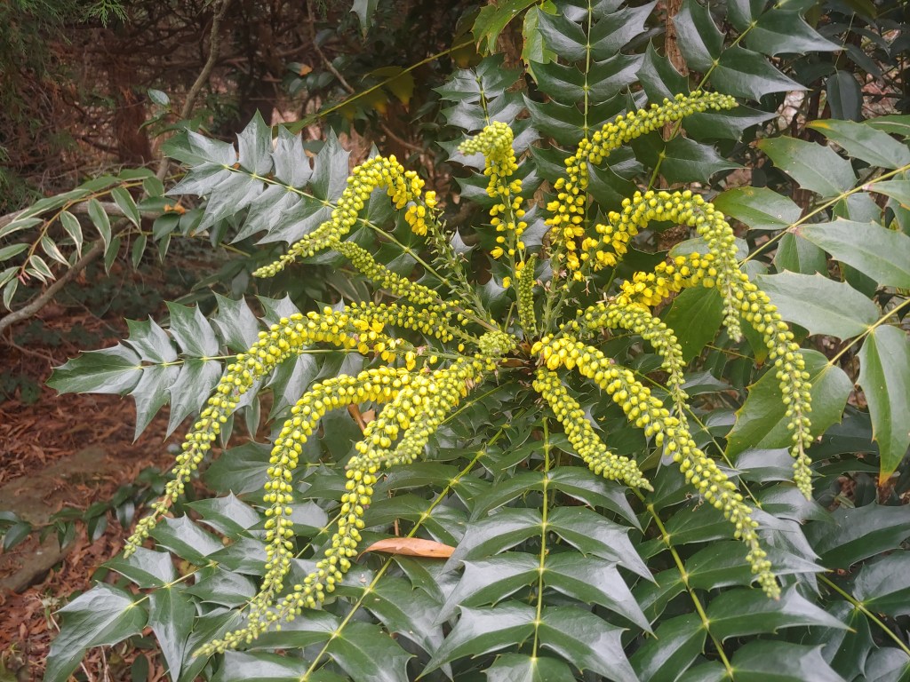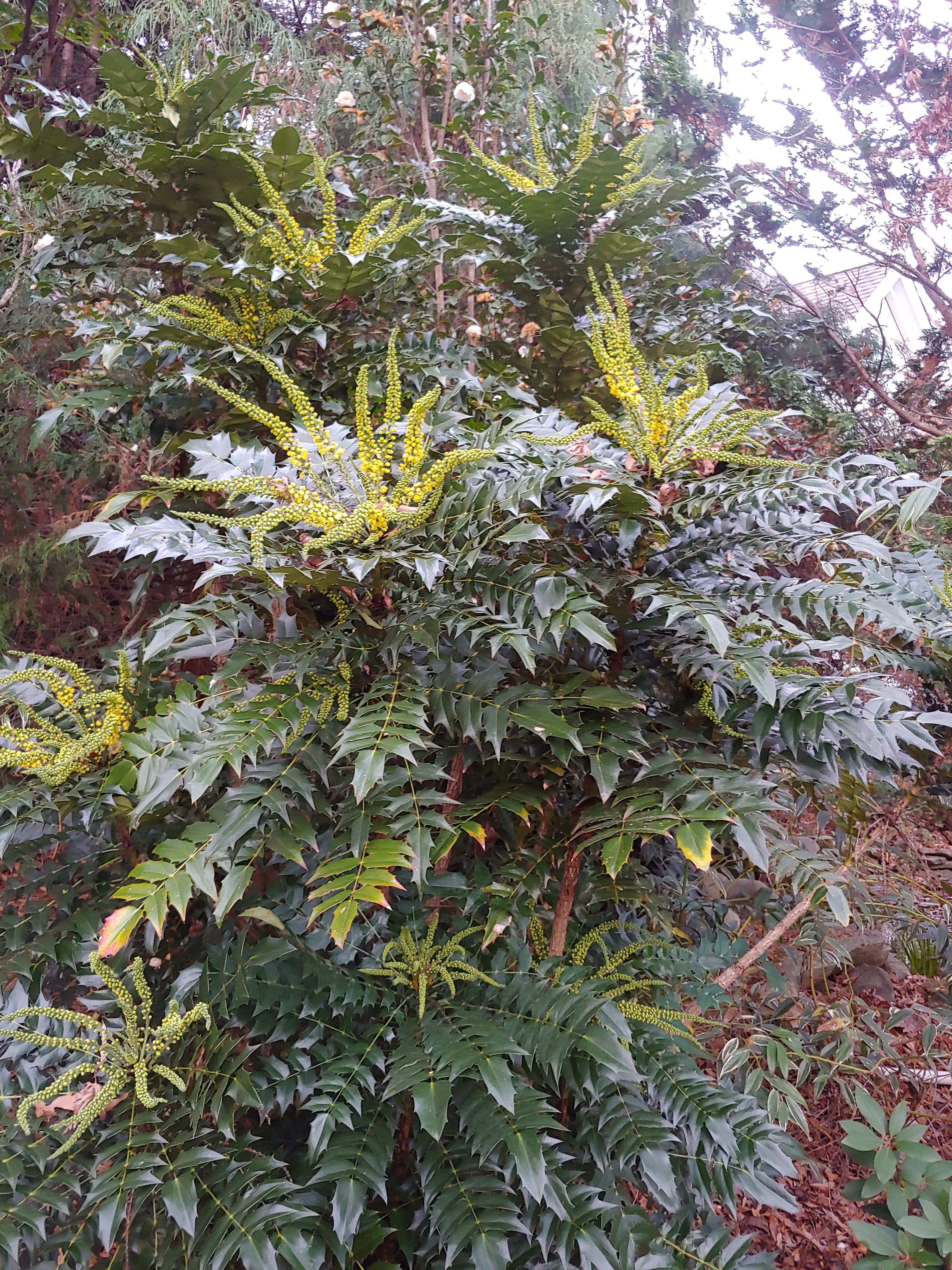 A few late flowering common witch hazels (Hamamelis virginiana, above) continue to flower as others are well past flowering. Vernal and hybrid witch hazels will not flower until the second week of January, so at least a short period between flowering of one and the other is expected. The autumn flowering mahonias (Mahonia x media ‘Winter Sun’, below) have not reached peak bloom yet, so I expect these will continue to flower into the new year. A year ago, flowers did not fade until late in January when late winter flowering leatherleaf mahonias (Mahonia bealei) overlapped for a week.