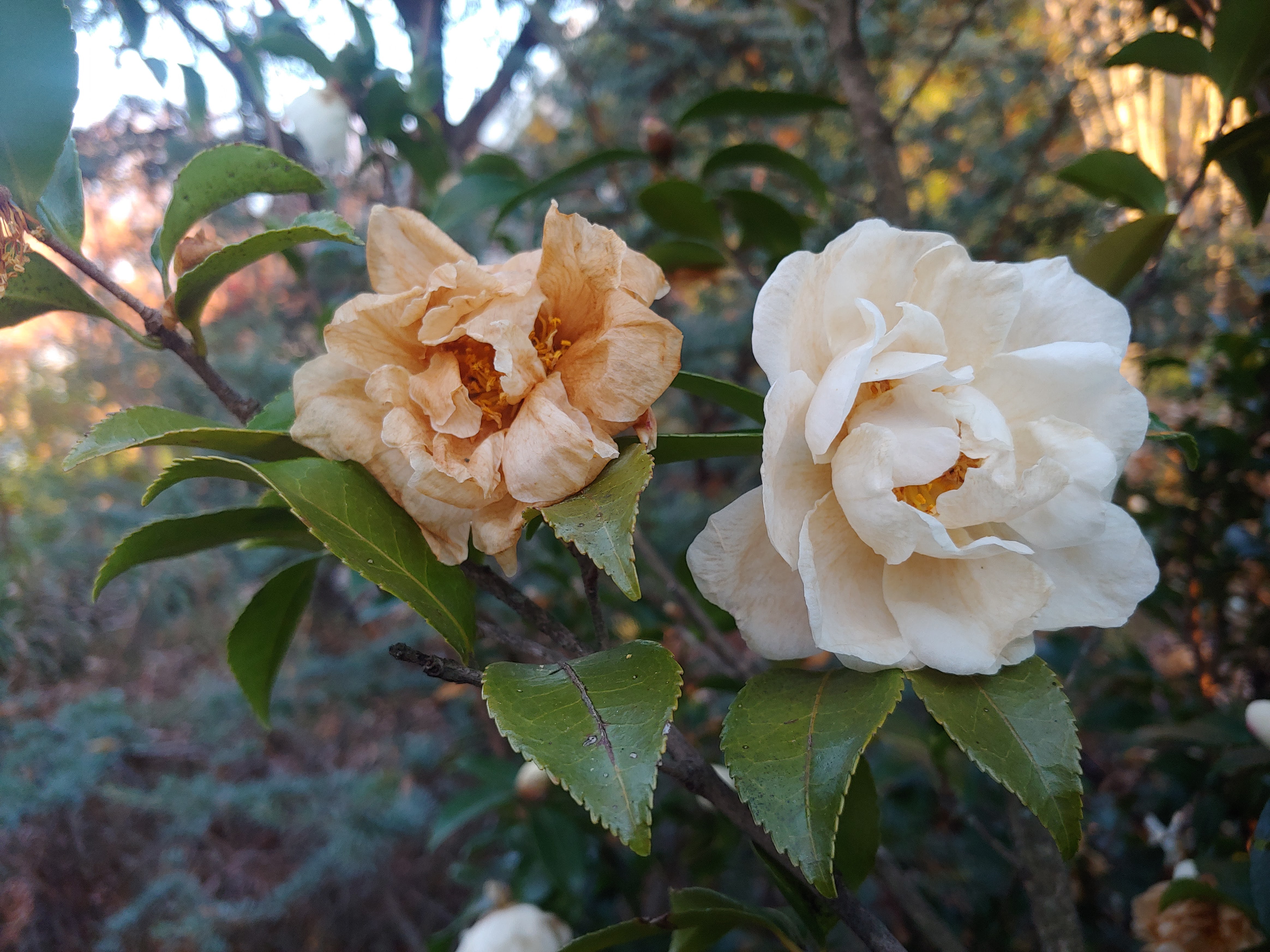 After several nights with temperatures dropping into the low twenties (Fahrenheit) abundant flowers of camellias (above) were damaged. But, milder daytime temperatures encouraged half opened buds so there are both browned and white (or pink) flowers on all the autumn flowering varieties. This cycle will continue through December, and two deeply shaded camellias rarely flower until late December or early in the new year when blooms are quickly damaged by freezes.