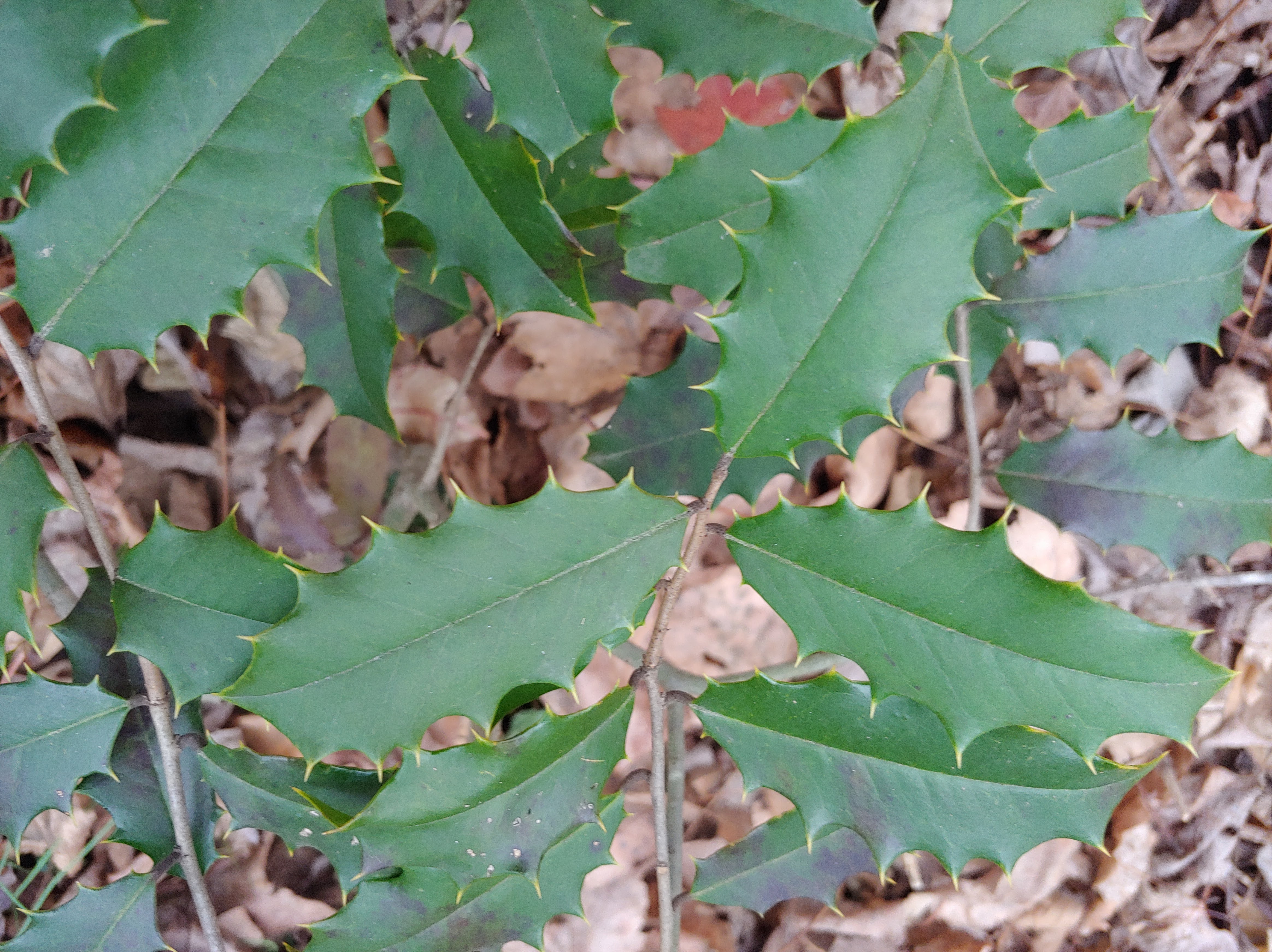 An American holly seedling with numerous spines and a narrower leaf than others.
