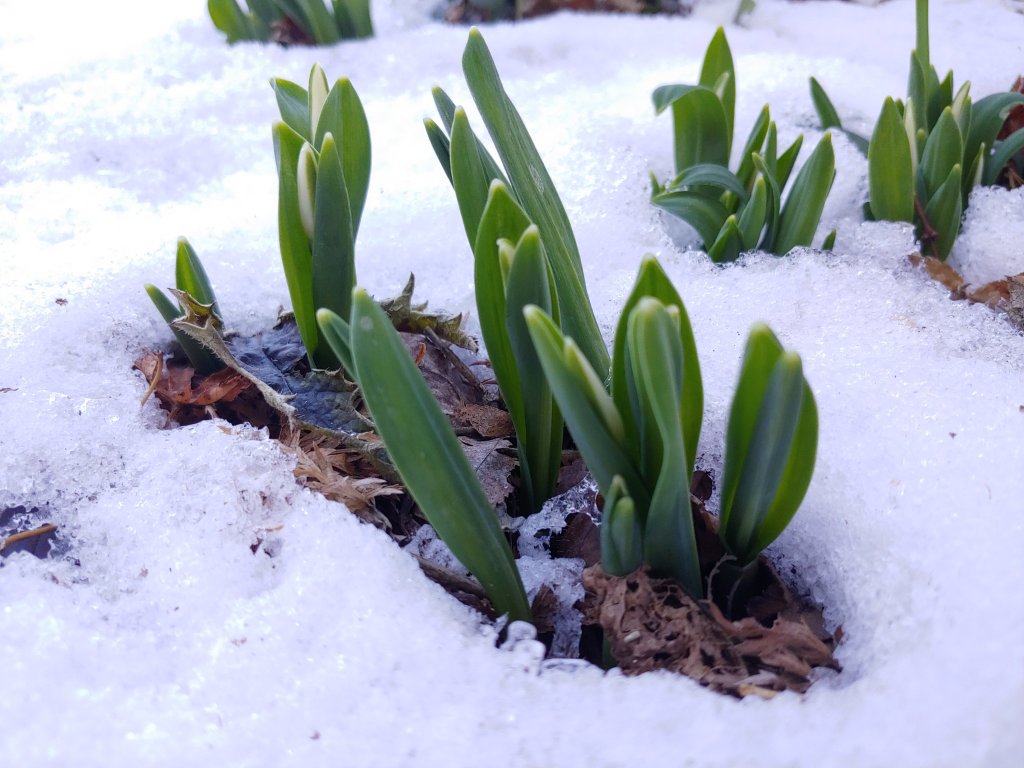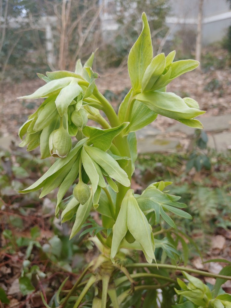 As snow in the shaded front garden slowly diminishes, due in large part to increasing ice, snowdrops continue their push (above), though the progression into bloom is stunted by days that do not rise above freezing. A warming weather forecast (though not warm) gives hope that flowering might soon resume, and that flowers of hellebores flattened by the snow will perk up.