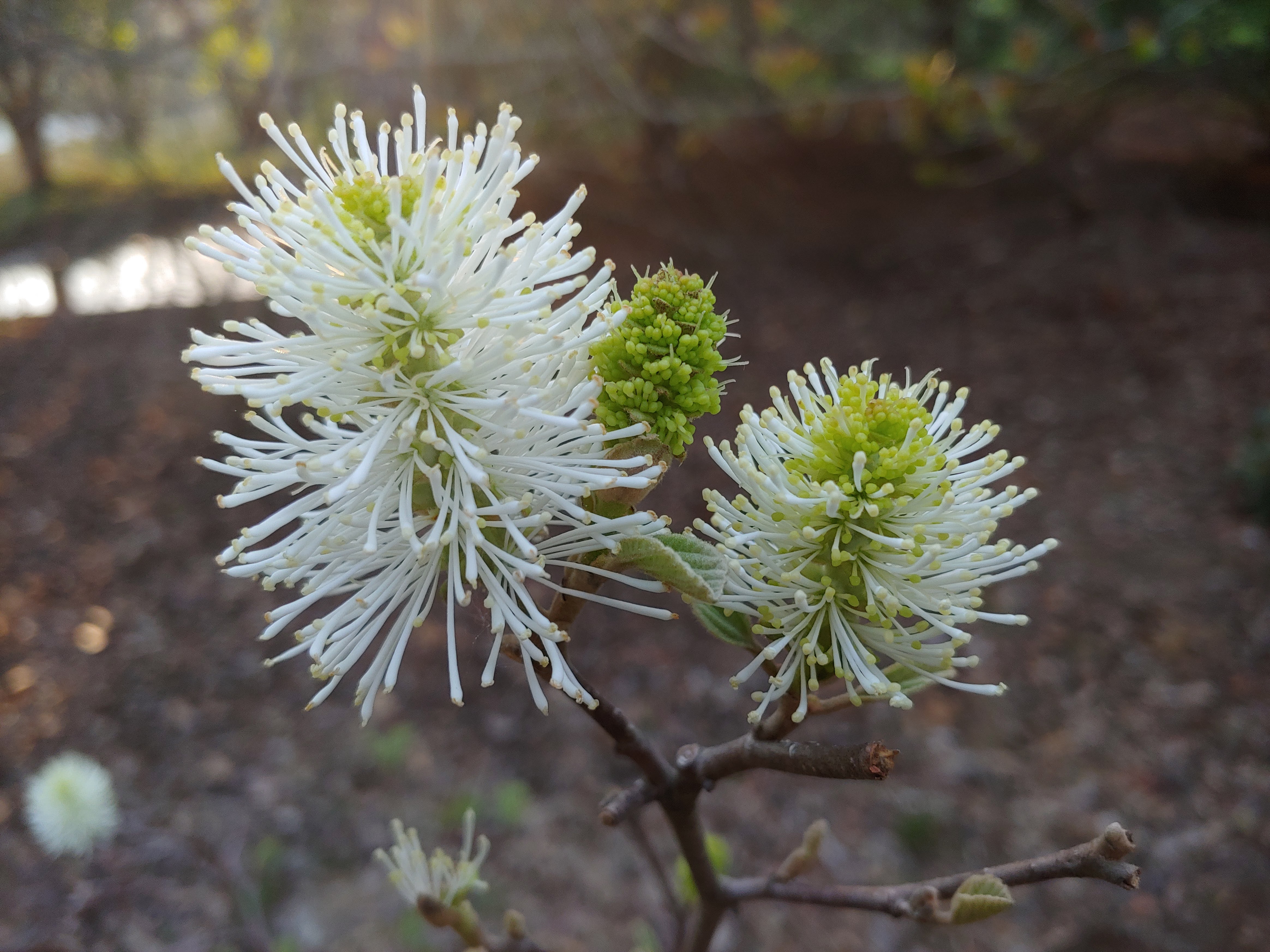Another witch hazel relation, Fothergilla (Fothergilla major ‘Mt. Airy’, below) displays more remarkable flowers, though blooms on one are sparse planted in too much shade. A second flowers better, but it was recently transplanted out of the vigorous patch of Mountain mint (Pycnanthemum muticum) where it was clearly not happy. A third was planted years ago along the northern border where it flowers beautifully, for the neighbor to see.