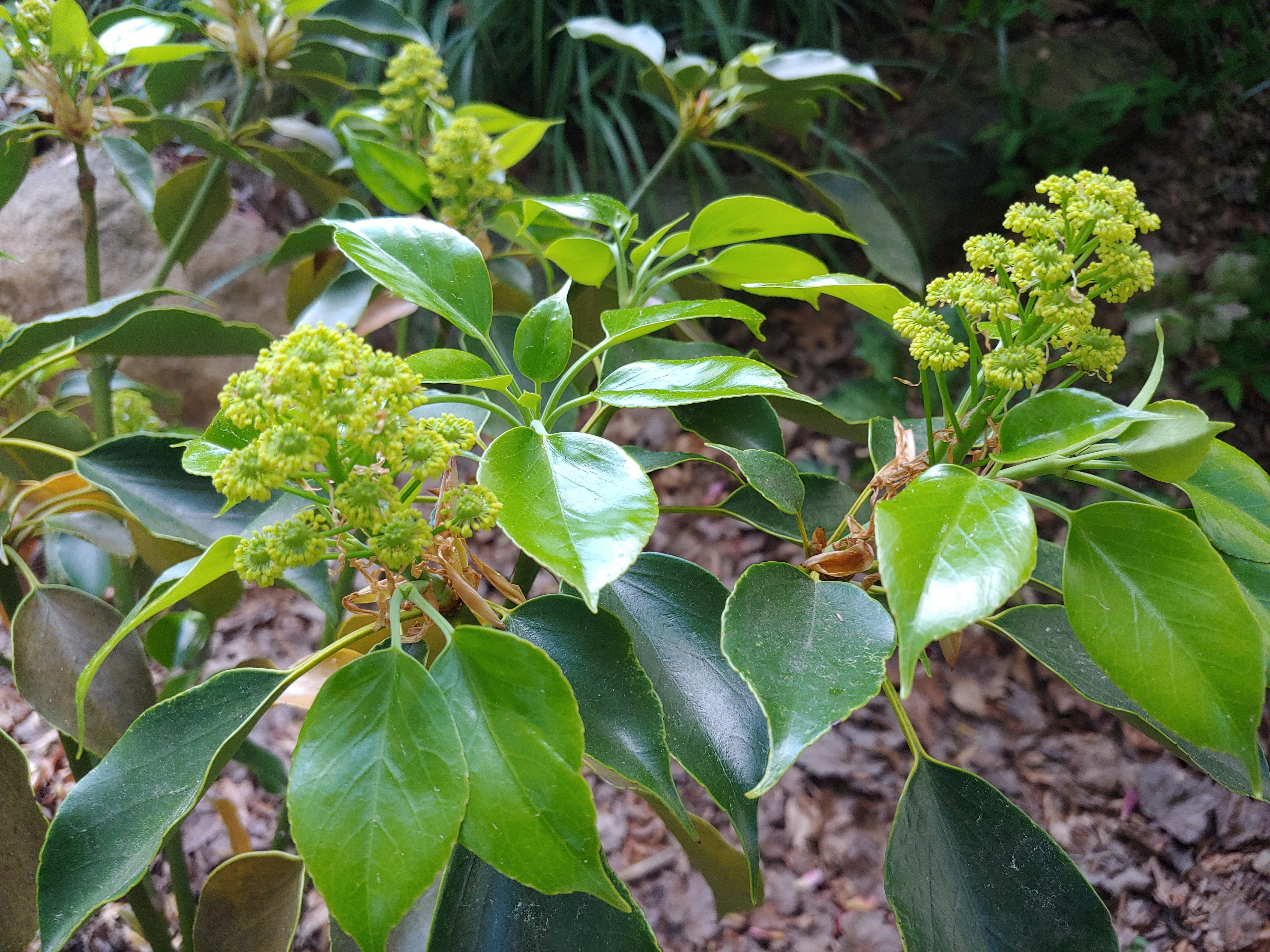 I am hoping for a bit more growth from the Wheel tree (Trochodendron aralioides, below) this spring. In its first spring a year ago growth was minimal, and while Wheel tree is reputed as slow, I look forward to more than a few inches of growth now that its roots are more established. But, already I marvel over the flowers that have not fully opened. A year ago there were none, and today they are quite marvelous as they open, though not colorful. The developing flowers clearly demonstrate the reason behind the tree’s name.