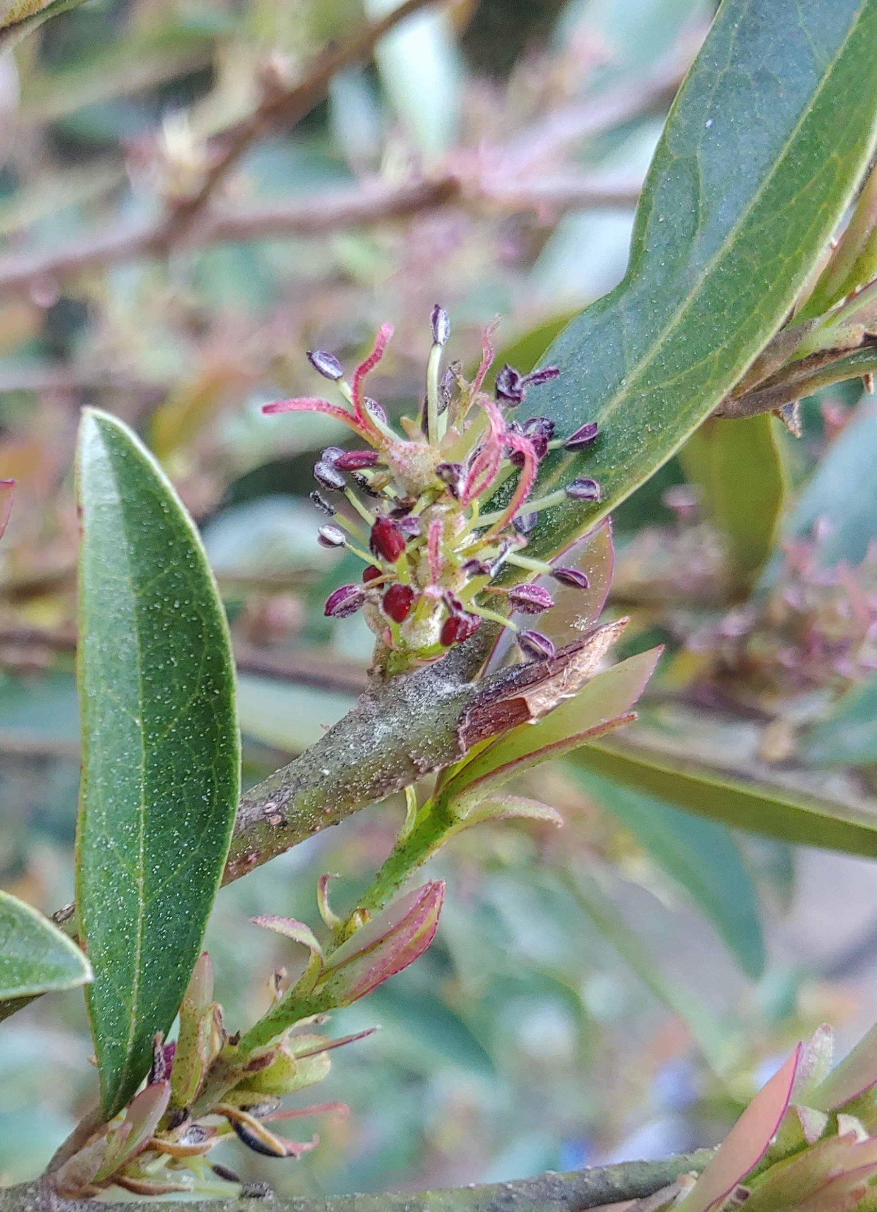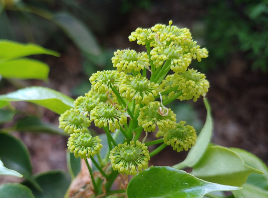 Finally, I see the small flowers of the witch hazel relative, Distylium (below), that has become quite popular in the southeastern states, while it is less common in this area close to the northern tip of its hardiness. Its flowers are unremarkable, but with a small collection of witch hazels (Hamamelis) I had to have one when they first became available. In fact, there are two, one that barely survives in deep shade and one that thrives in mostly full sun. I don’t think distylium is popularly regarded as an ornamental, primarily functioning as a moderately sized evergreen sheared into a tight ball as a hedge. Nothing is sheared in this garden, so the evergreen is unremarkable, but I have the one I was was looking for.