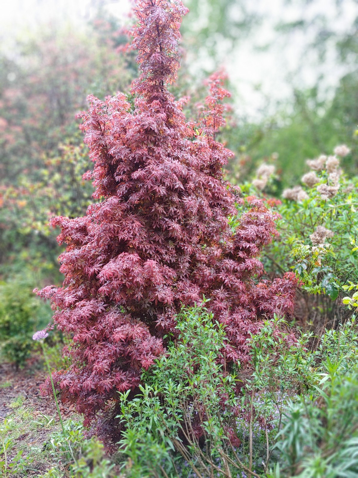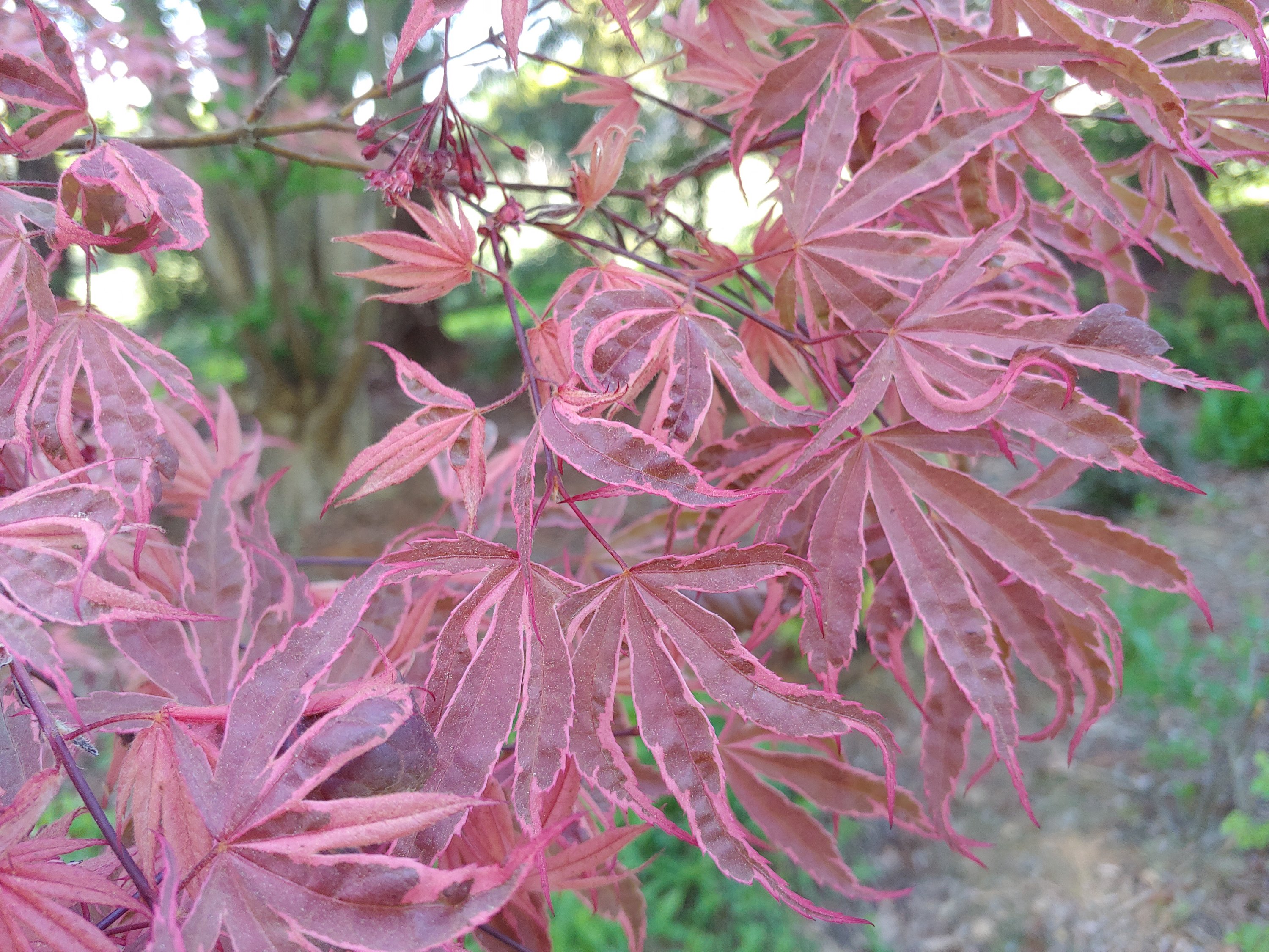 There are many more maples, but we’ll end today with my least favorite Japanese maple, ‘Gwen’s Rose Delight’ (under the trade name ‘Shirazz’). In spring the new growth is delightfully bordered with a line of cream, but whether it is the local heat or excessive dampness, this unfortunate maple fades badly to a sickly, faded red. I know, not its fault.