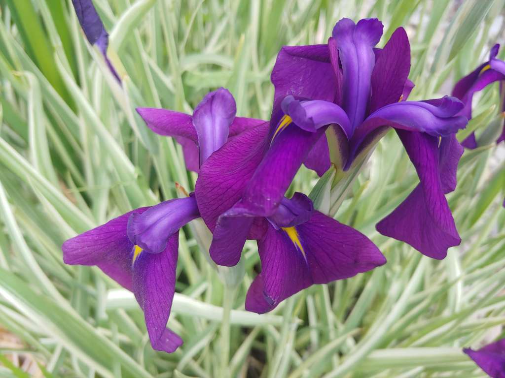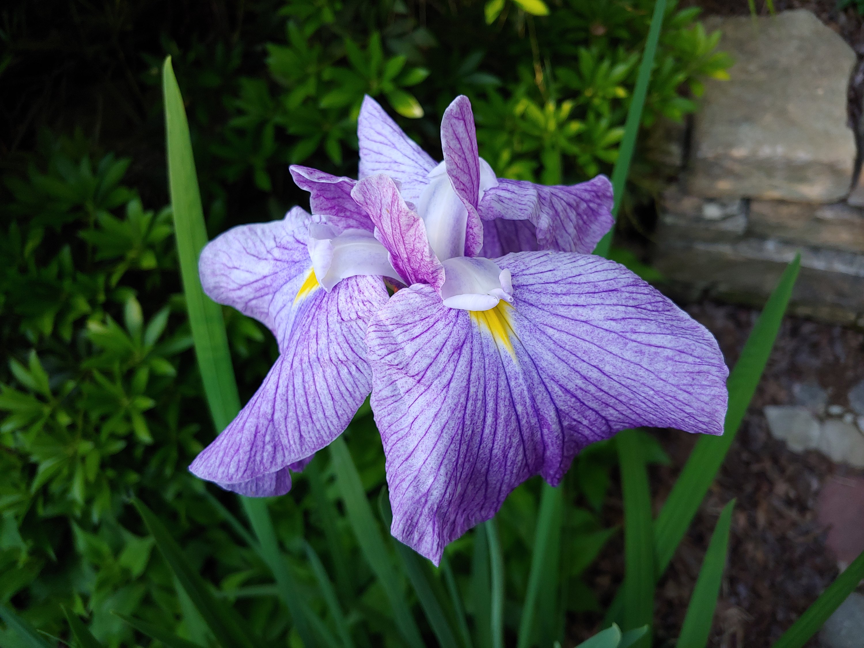 Without a doubt, the irises are happy here, the wetter the better. When yellow flag irises (Iris psuedacorus) overwhelmed Japanese irises (Iris ensata, above and below) at the edges of the koi pond, these were moved to the damp ground beneath the overflow of the pond along with Versicolor irises. As the yellow flags and versicolor irises fade from bloom, the Japanese irises are coming on, so there will be flowers on one or the other for nearly two months.