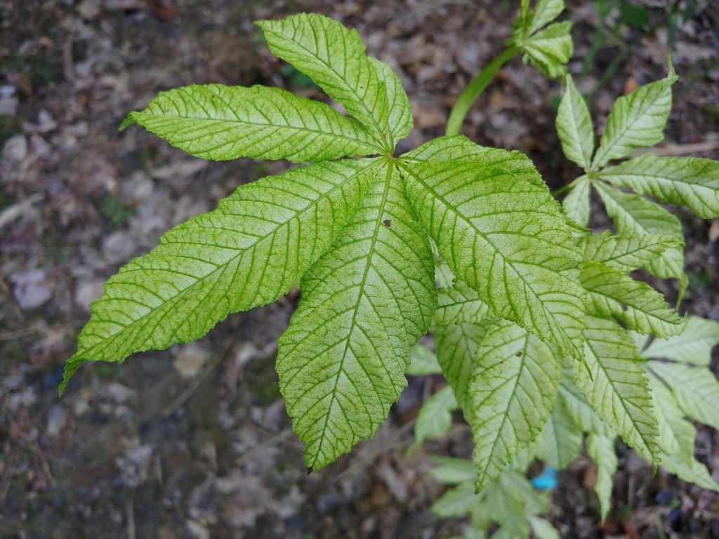 Two small, variegated leaf horse chestnuts were planted just before the last freeze. One was damaged considerably (Aesculus hippocastanum ‘Memmingeri’, above), but the browned leaves were stripped and a few weeks later it has bounced back, and appears to be in excellent health despite the setback. Perhaps I am getting too old to see newly planted trees reach maturity, but the positive argument is that I’m unlikely to be around once they grow too large. Both horse chestnuts are planted in damp soil, and while two related bottlebrush buckeyes grow happily in even damper soil nearby, I’ve lost too many woody plants in this area to be comfortable until a tree grows for a few years.