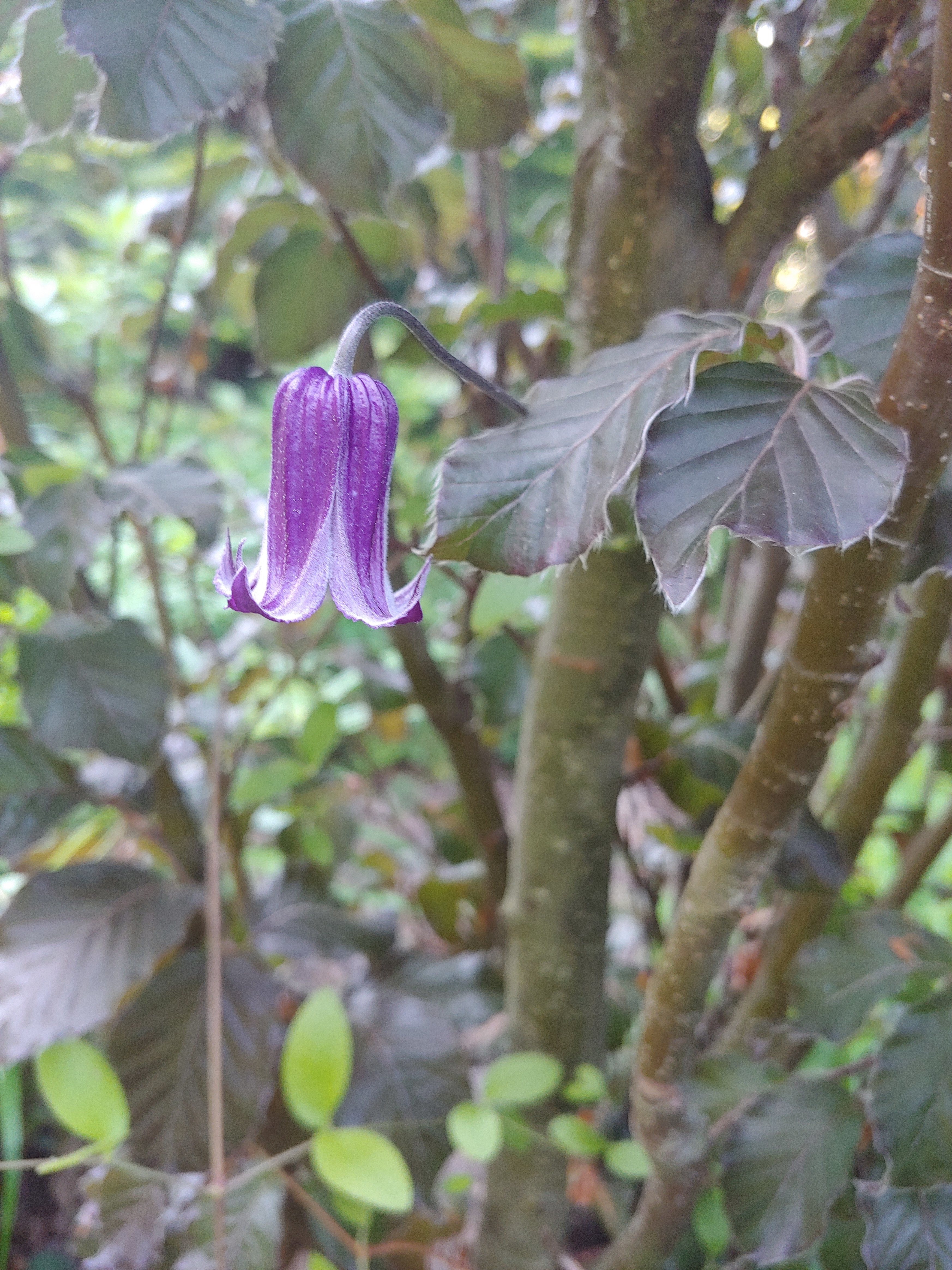 A clematis planted several years ago under the red horse chestnut was too shaded to flower, so several weeks ago it was dug and moved to climb up through a newly planted ‘Red Obelisk’ beech (above). This should be ideal, shaded roots and a sunny top. The tree’s columnar shape should not shade the clematis, and with flowers opening daily I think the move will be a success. There is no reason to grow clematis if they don’t have enough sunlight to flower, and most of the garden’s clematis grow up through trees and shrubs so I must watch to be certain they don’t become too shaded.