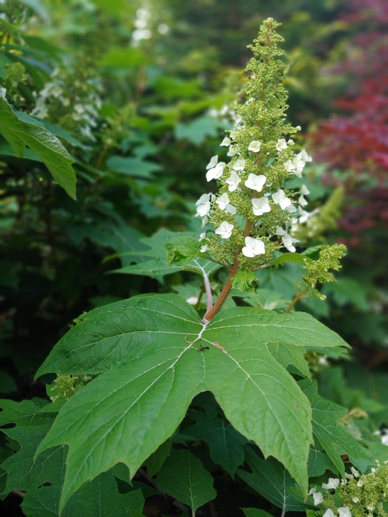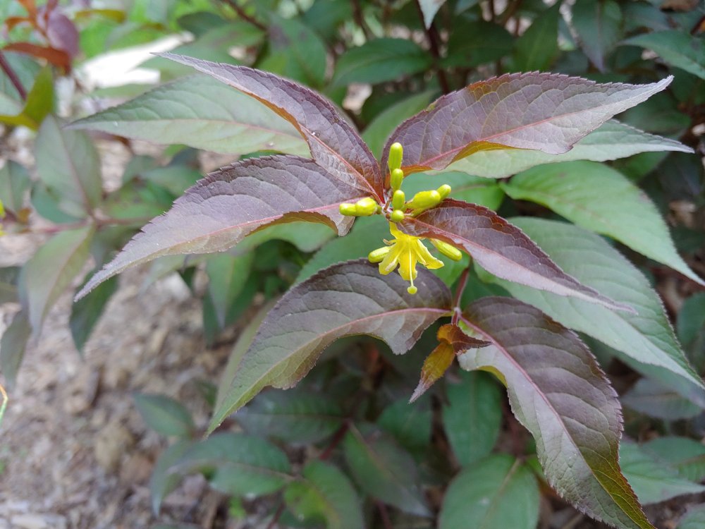 I’ve done it again, delayed too long in spraying the deer repellent until damage is noticed instead of preventing it. A few flower buds on an ‘Annabelle’ hydrangea have been lost, and growth tips and flowers are gone from the upper half of a dark leafed bush honeysuckle (Diervilla splendens Firefly Nightglow, below). Two in shadier spots were not bothered, but the foliage does not darken with less sunlight and flowers are likely to be a few weeks behind.