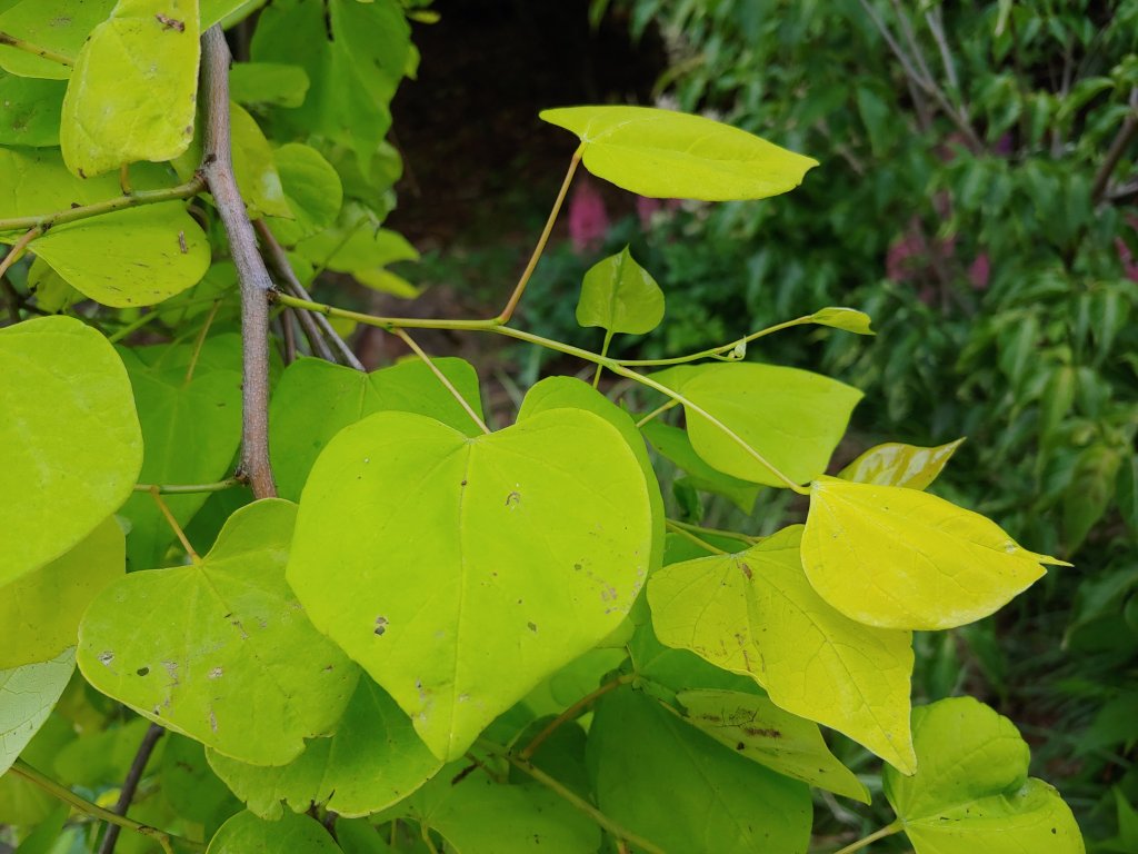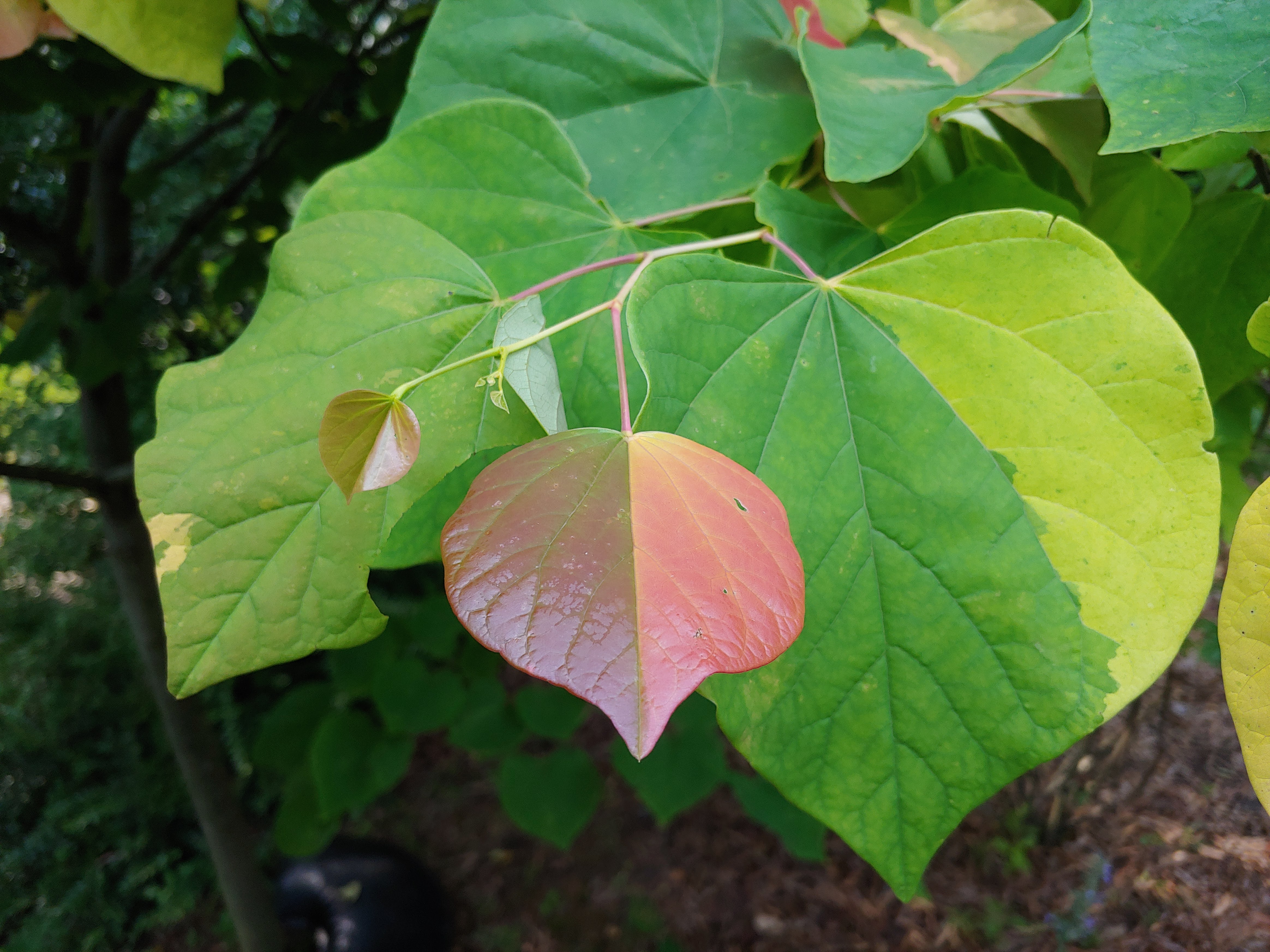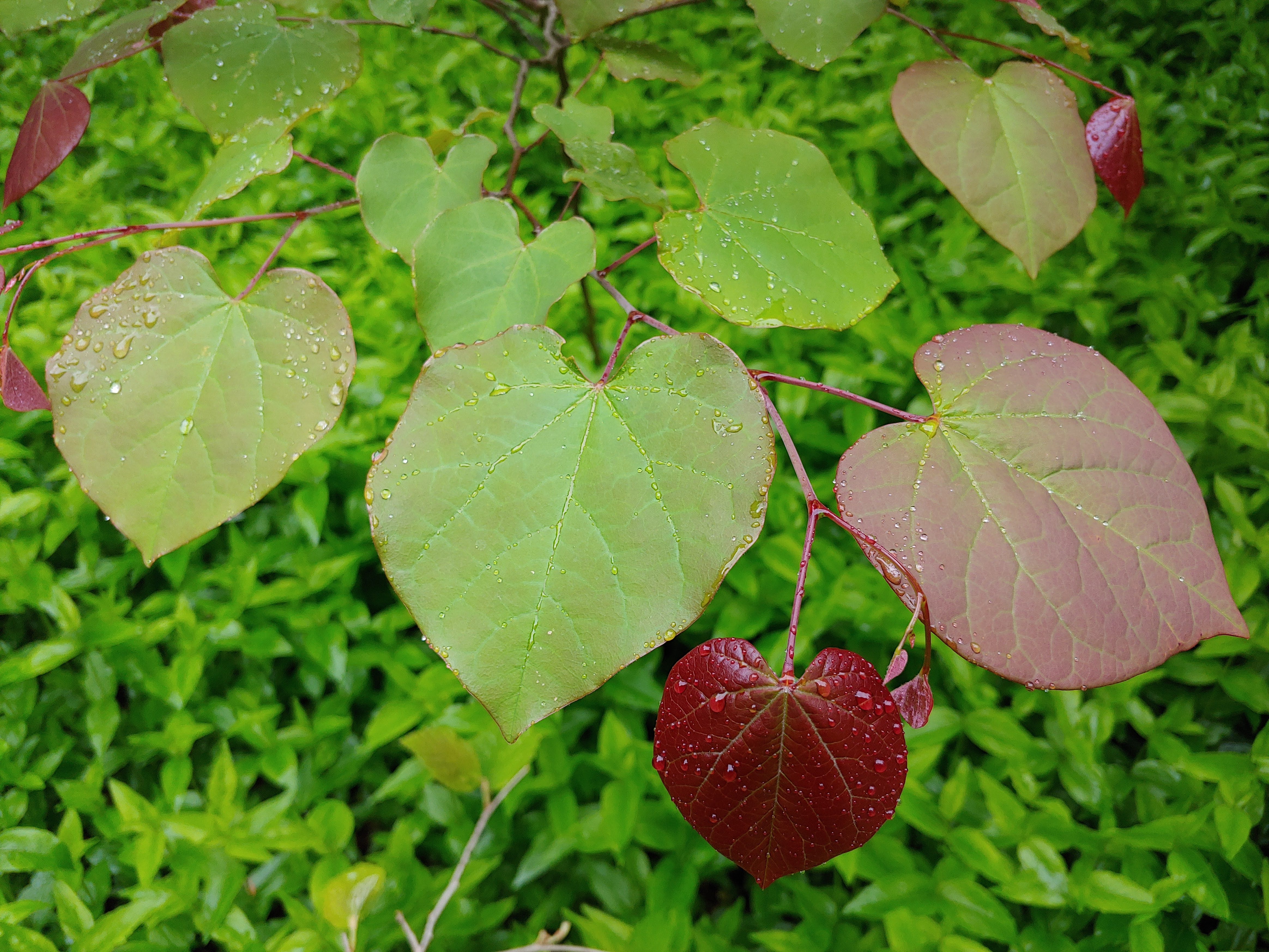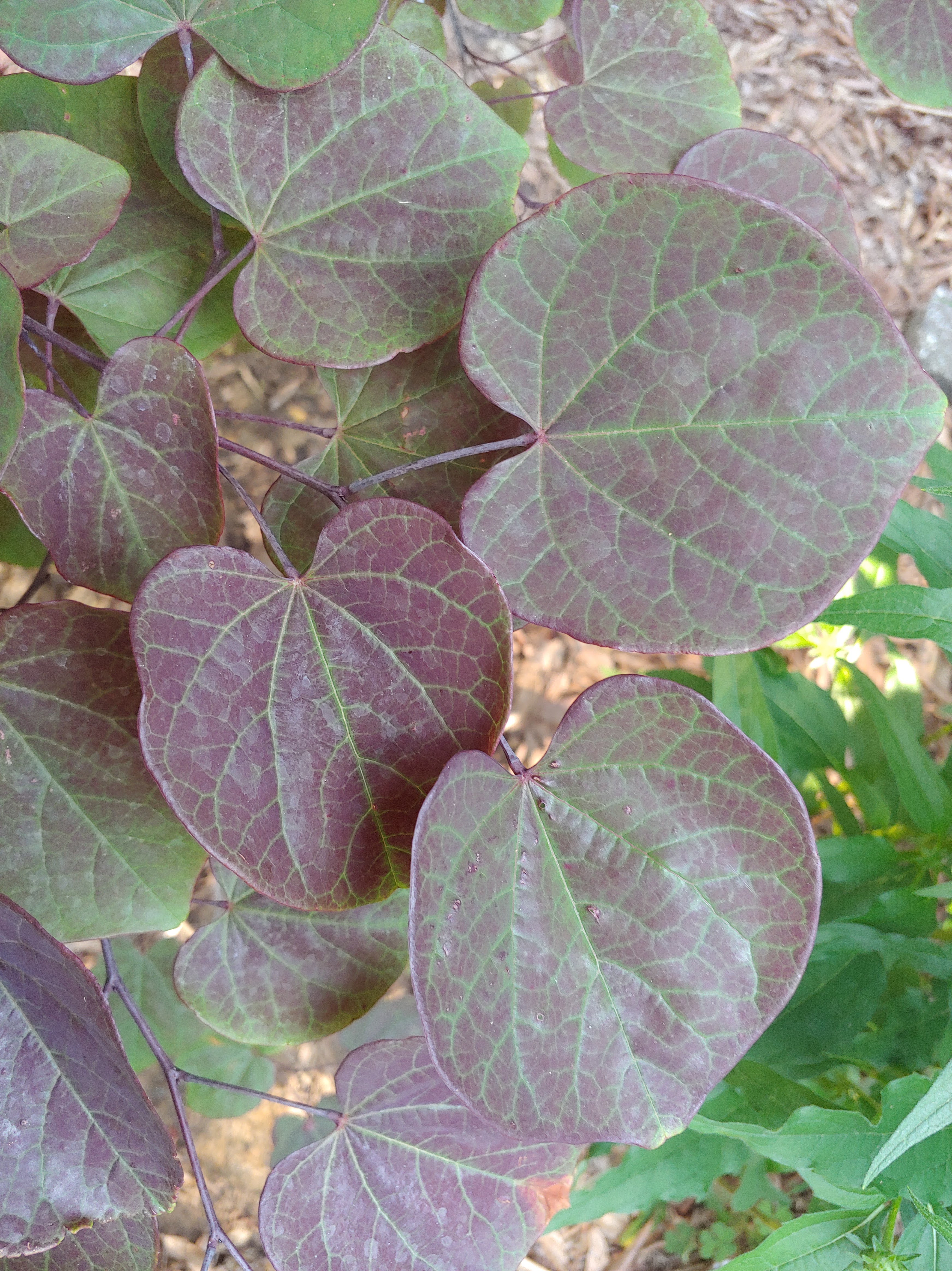 Two small redbuds, a seedling with red leaves that fade to green (below), and the multicolored leafed ‘Flamethrower’ will someday be treasured additions to the expanded lower, rear garden. No matter that I occasionally think my wife is correct, there is more space to plant, but with very limited space for trees, and still a few Japanese maples I must add, so these could be the last of the redbuds.