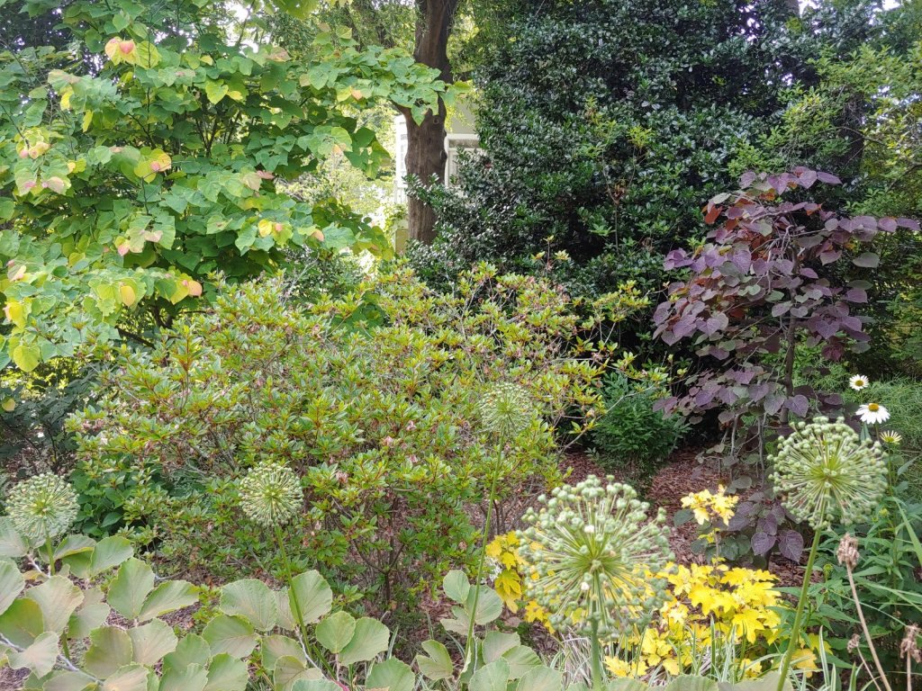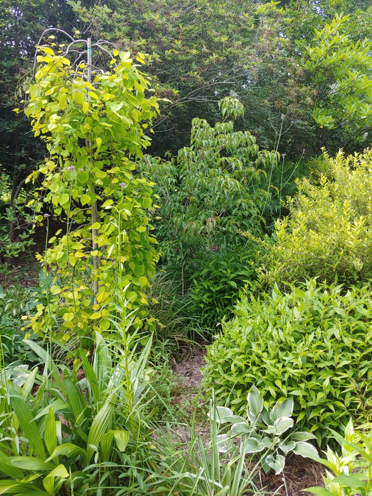The two weeping redbuds are not side by side, and I think that both fit wonderfully into their new positions. ‘Ruby Falls is planted close to the unnamed redbud (below) discovered in a North Carolina nursery that is a mutation of the yellow leafed ‘Rising Sun’. I doubt that this prize is worthy of introduction into commerce, but a one-of-a-kind is most treasured in a collection. ‘Golden Falls’ is planted near a ‘Scarlet Fire’ dogwood that was added this year to fill the space vacated when the last of the two ‘Silver Cloud’ redbuds was chopped out.