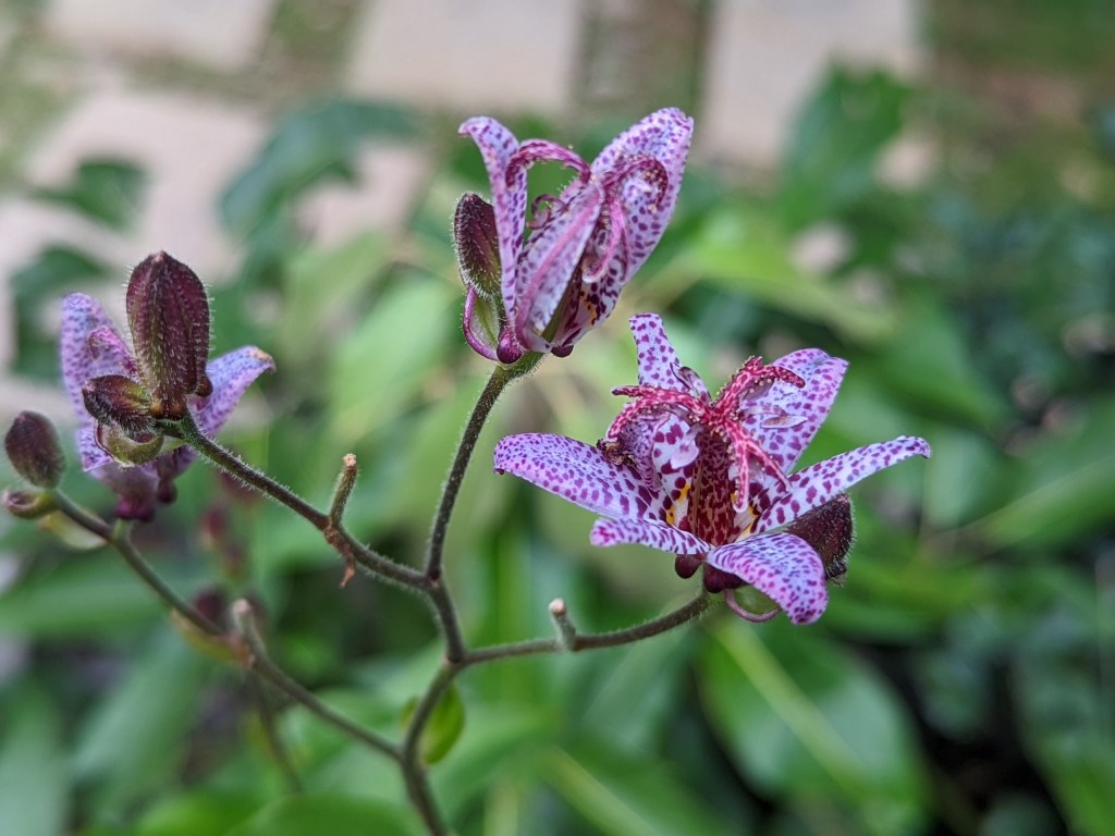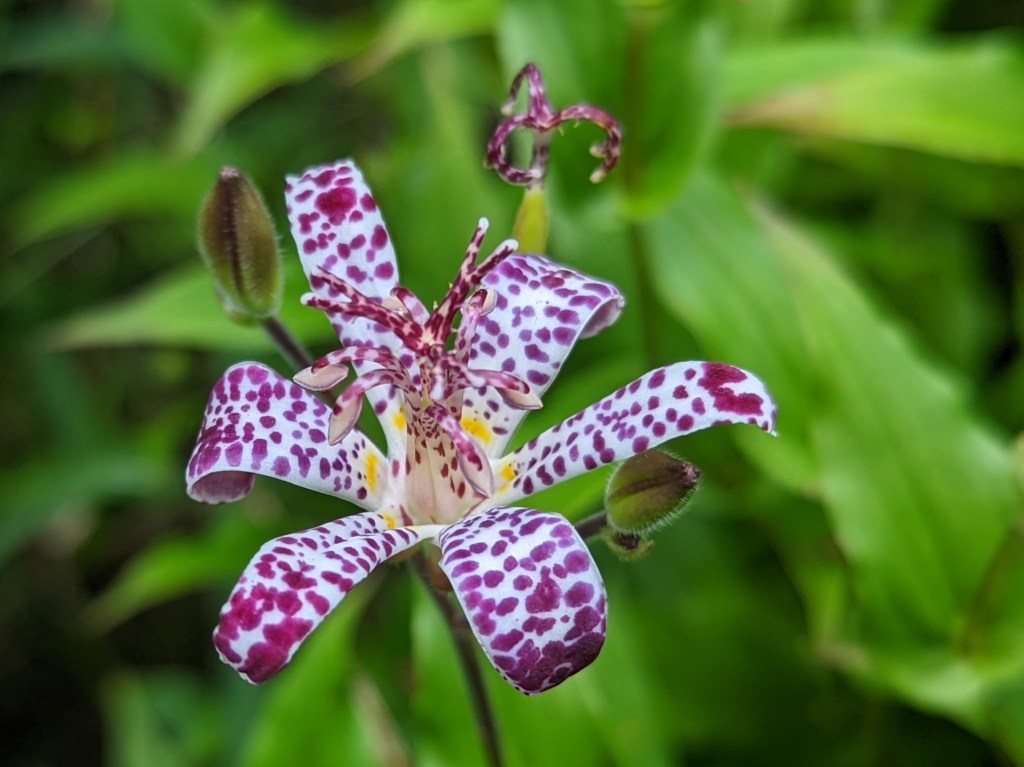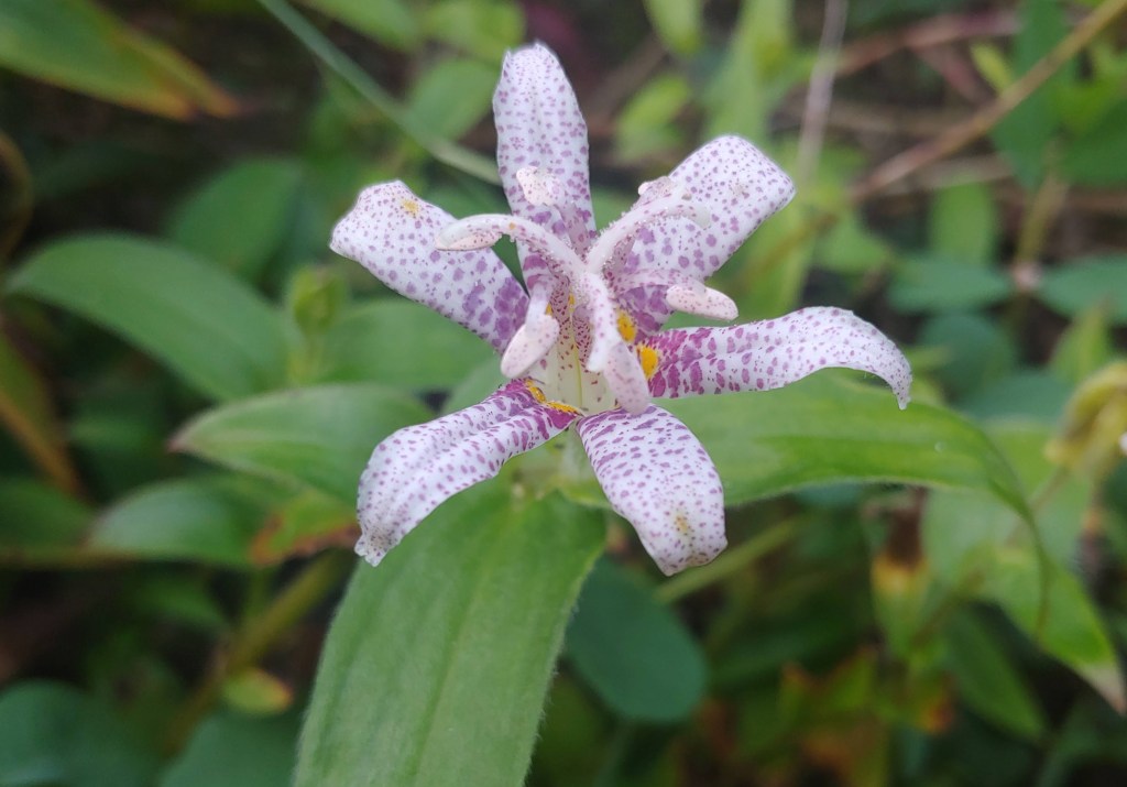 The abundance of toad lilies is now somewhat managed. Several years ago, with more open ground, ‘Miyazaki’ (Tricyrtis hirta ‘Miyazaki’, above) seeded about, and occasionally dense clumps were divided and potted to grow on as giveaways. Today, seedlings are scarce with more ground covered, but clumps grow fatter each year and a few new cultivars are purchased each year, despite my pledge not to add new ones since I can hardly identify ones that I’ve planted.