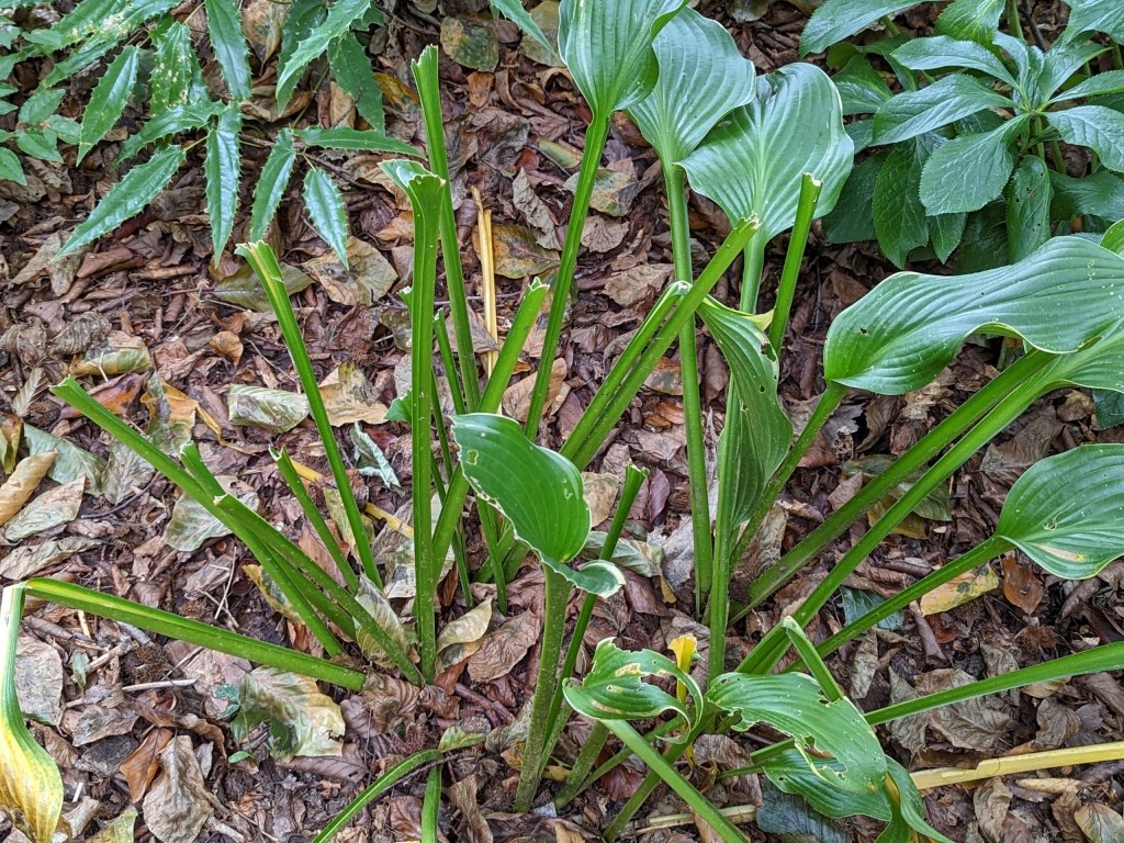 As the garden’s dormant season approaches, the faded effect of deer repellent last sprayed in August is readily apparent. Vulnerable hostas were nibbled weeks ago, but now ones with large, corrugated leaves that were thought safe from damage have bare stems (below), with only the lowest growing types uneaten but fading in the cold. The hostas’ season has ended, so why not reward persistent deer?