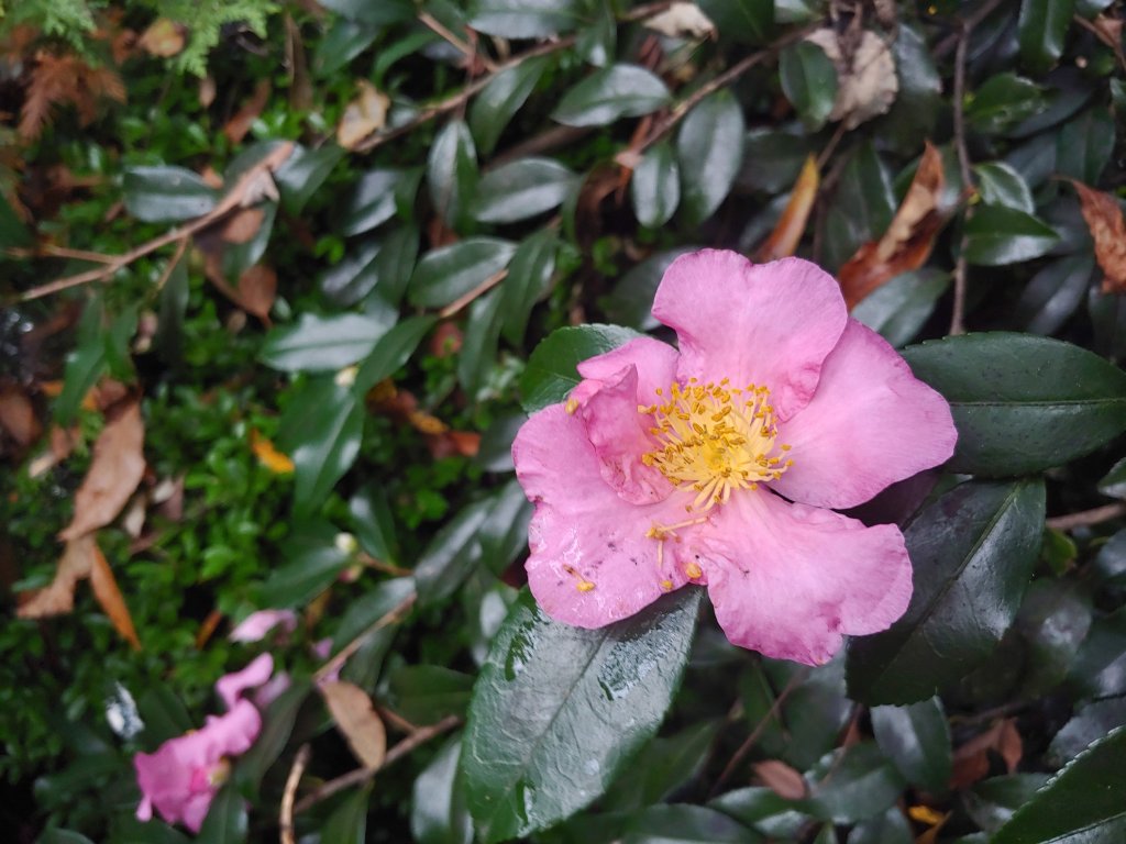 Surprisingly, the garden’s late season blooms have survived two recent frosts, but the remaining days of colorful flowers and green foliage must be few. With recent mild temperatures a few bees are seen, but soon only autumn flowering camellias (below) will be available on the scattered warm afternoons.