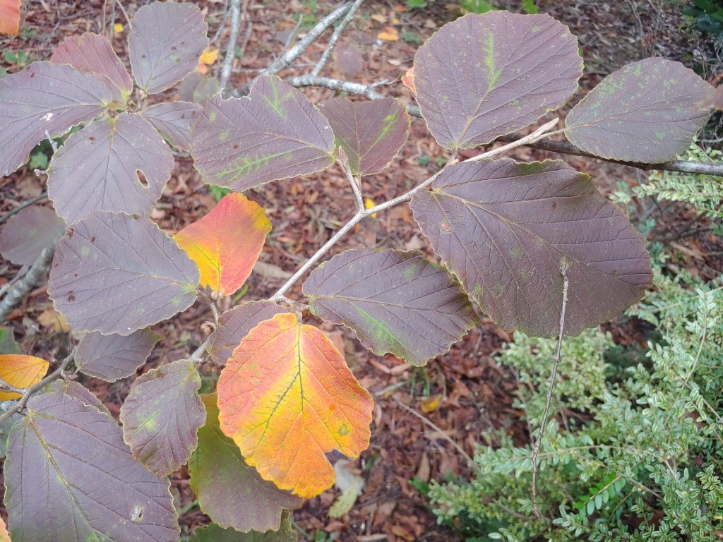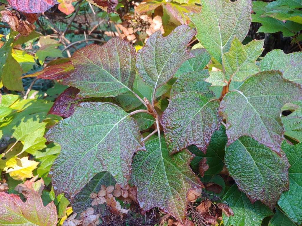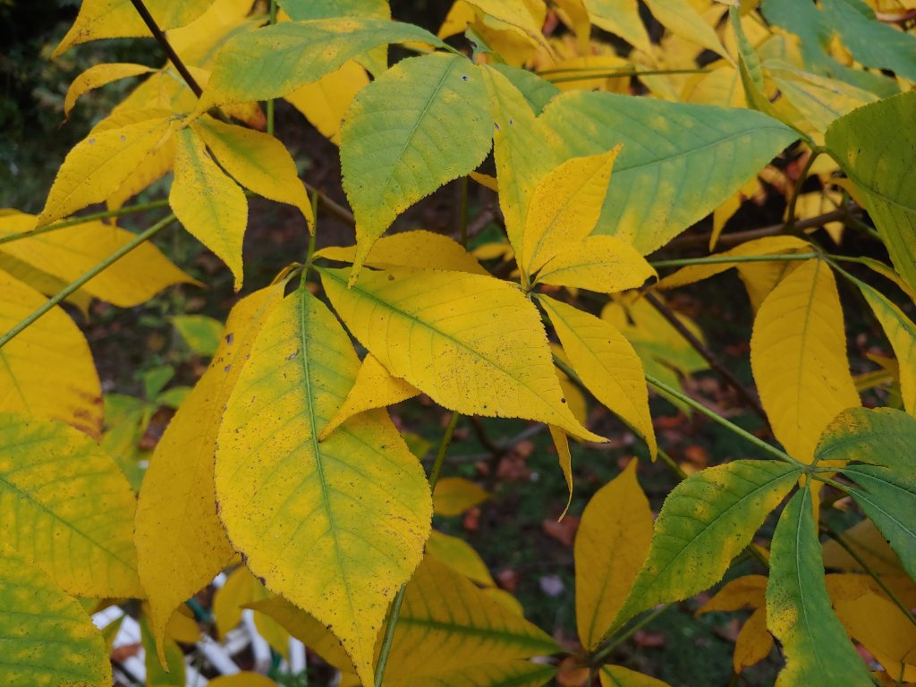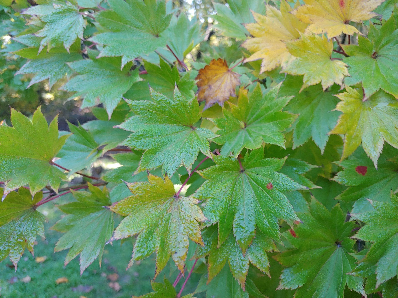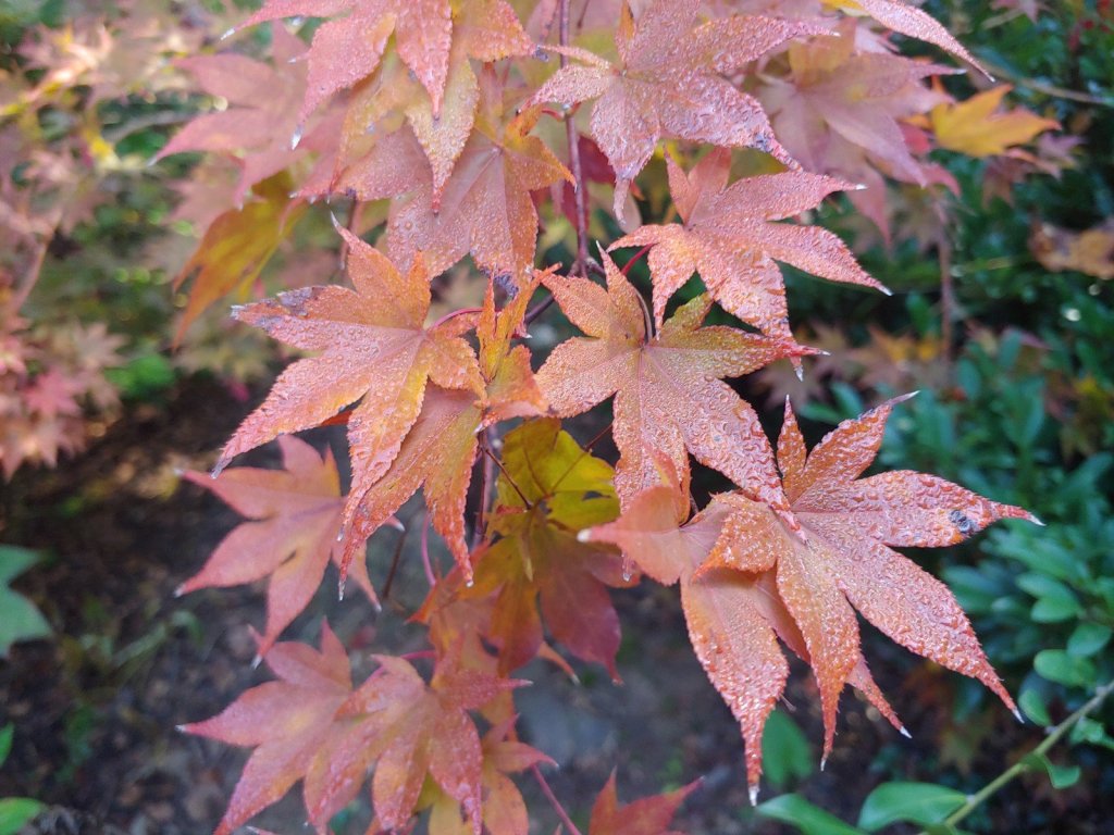 Autumn foliage colors deepen with every cold night, with this morning’s dew highlighting the earliest leaves to turn. Yellow maple leaves from the neighboring forest drift to the ground with every hint of breeze, though it will be several weeks before the mass drop covers the garden.