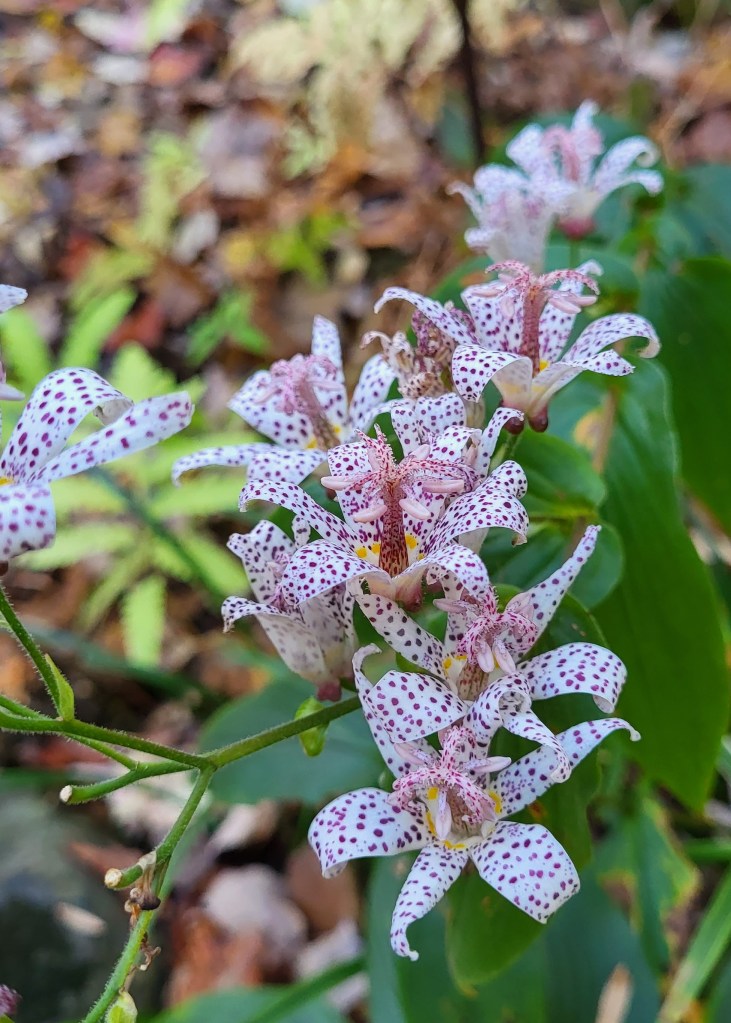 I must protest. I hear from other area gardeners that they have not yet experienced frosts or several freezes that have called a halt to holdover flowers from late summer and earlier autumn in this garden. I assumed, incorrectly, that the freezes were widespread. Still, a single toad lily (Tricyrtis) protected by an overhanging mahonia is flowering, though all others have declined rapidly in the chill that has been followed by very mild temperatures.