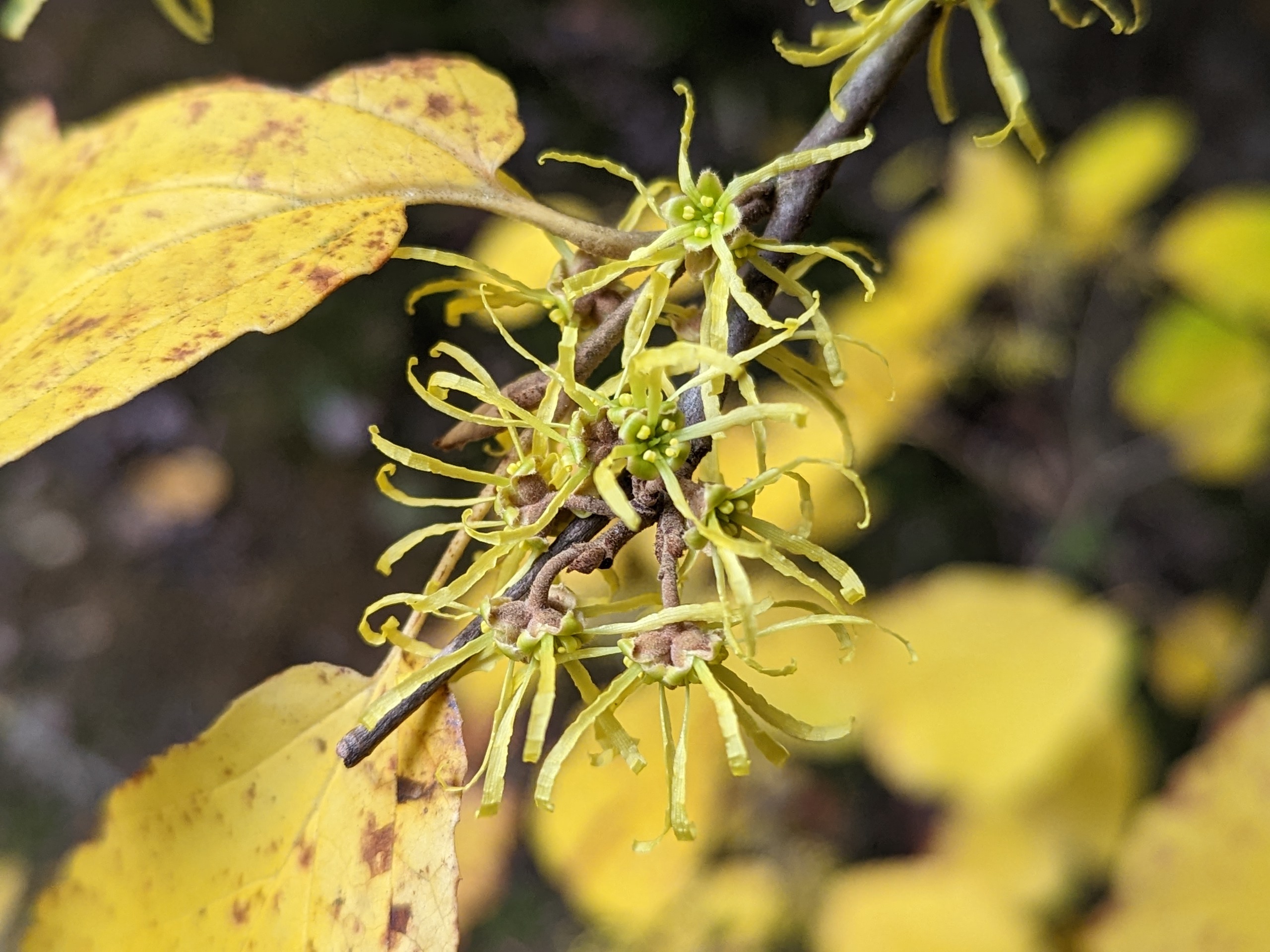 Three species of witch hazel, Common (Hamamelis virginiana), Vernal (H. vernalis), and hybrids (H. x intermedia) flower to fill the late autumn and winter months. Common witch hazels are the least showy, and often flowers must compete with leaves that hang on in the early weeks of their bloom. Vernal and hybrid witch hazels begin flowering in mid January, finally fading in March, so while the autumn chill has ended many blooms, there are more to come.
