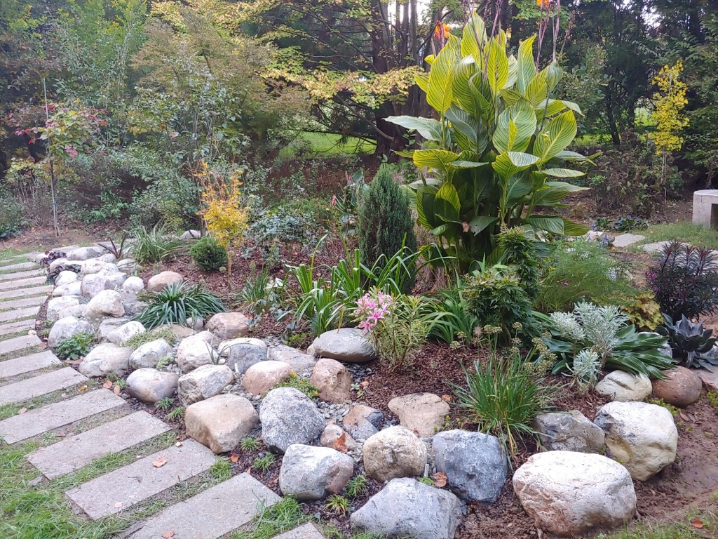 The lower garden is lovely, the boulders and stepping stones give structure and statement. I wonder if you fenced the banana plant initially, if the deer would touch it later?