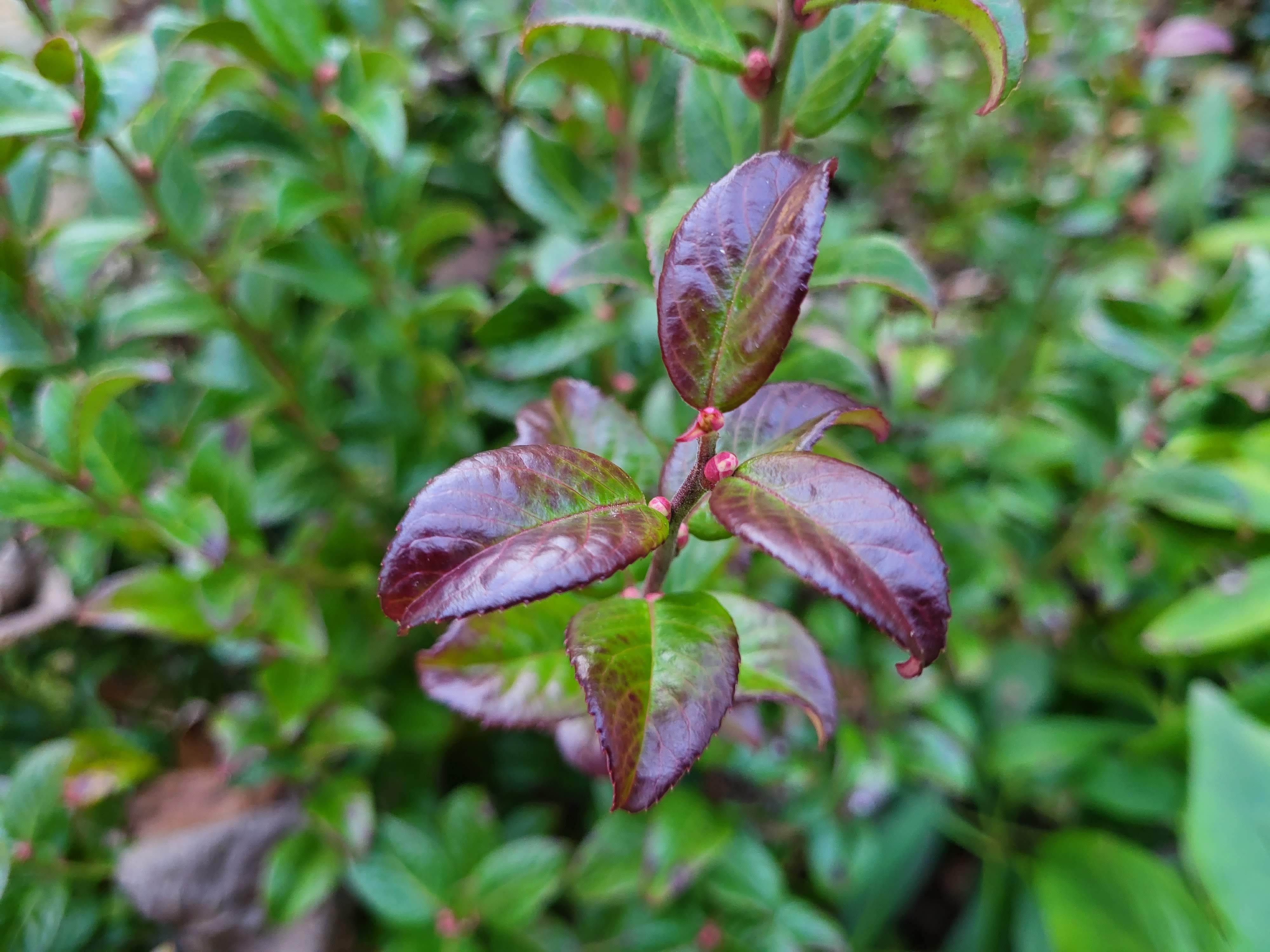 The commonly available varieties of leucothoe could use a bit of improvement. Both green leafed and variegated types are prone to leaf disfigurations, and while arching branches might be termed “graceful”, the shrub would be improved by a more compact form. Three leucothoe in this garden, Rainbow (Leucothoe fontanesiana ‘Rainbow’, above), variegated Coast leucothoe (Leucothoe axillaris ‘Variegata’, below), and ‘Curly Red’ (Leucothoe axillaris ‘Curly Red’, below) grow without a hitch in part shade, but I’ve too often seen diseased foliage in other gardens.