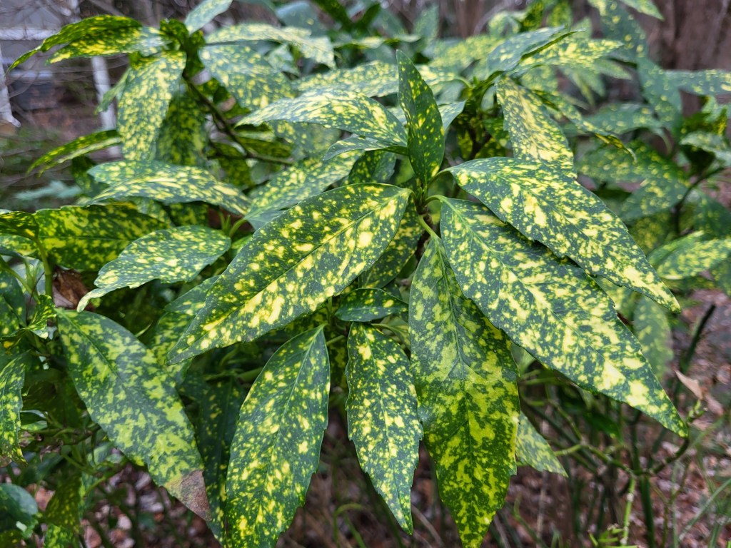 I confess to a horrible inattention in autumn, ignoring a minor incidence of deer nibbling the spotted aucubas (Aucuba japonica ‘Gold Dust’, below). I intended to get around to spraying the deer repellent sooner, but later I noticed many were completely defoliated. I didn’t realize how many aucubas were in the garden until they were bare, and now I must treasure the few that remain with leaves until they grow again in spring.